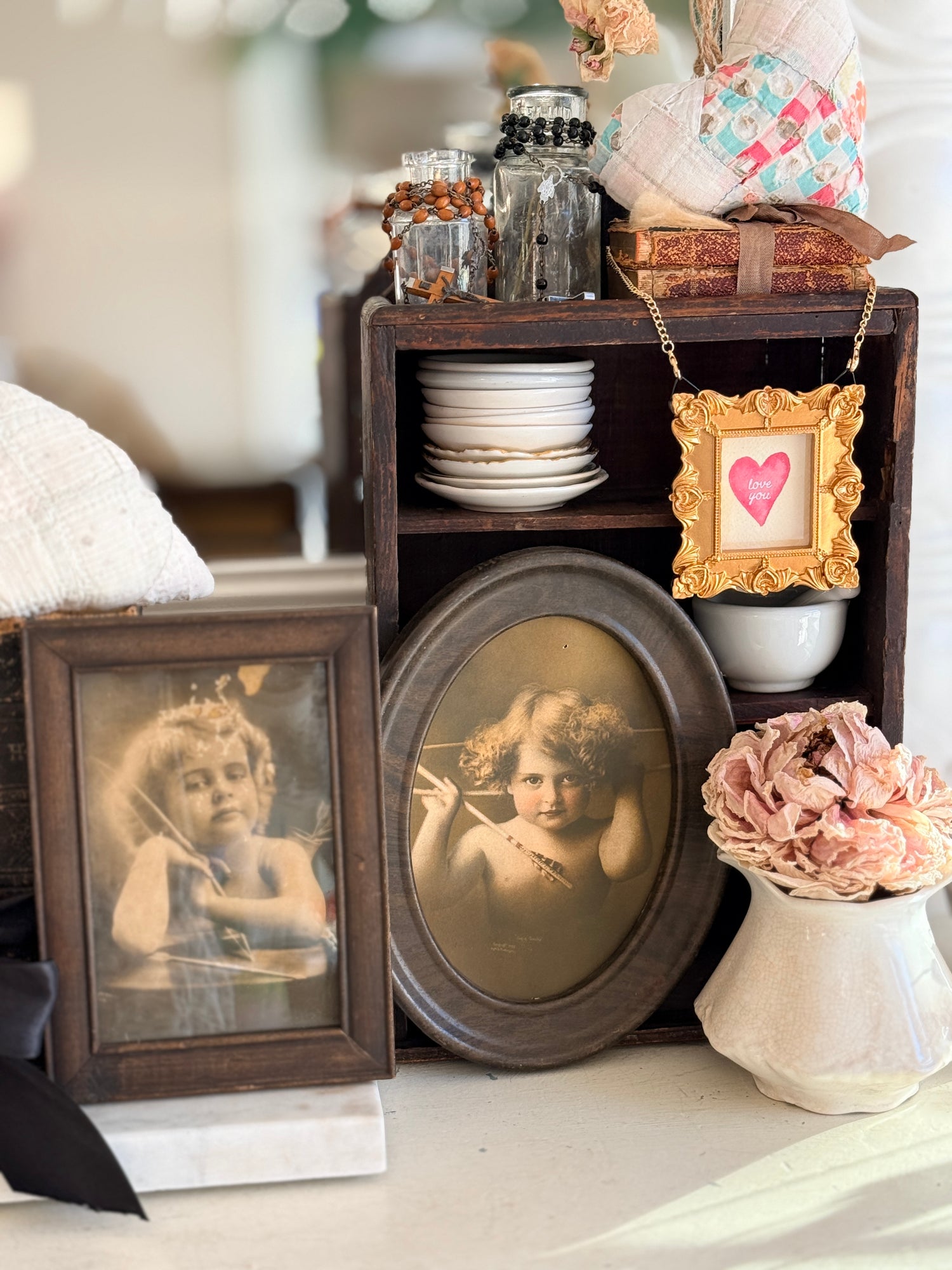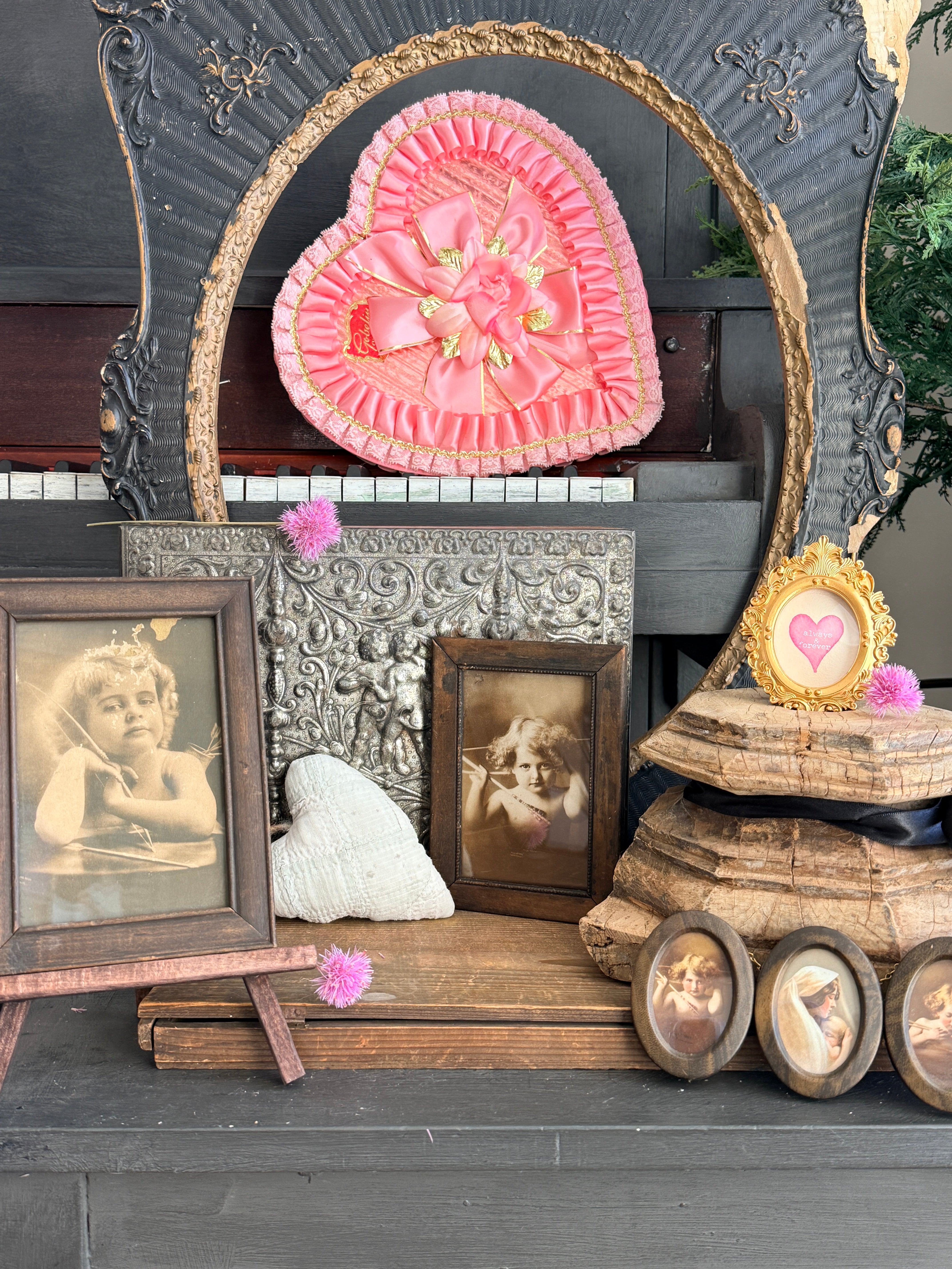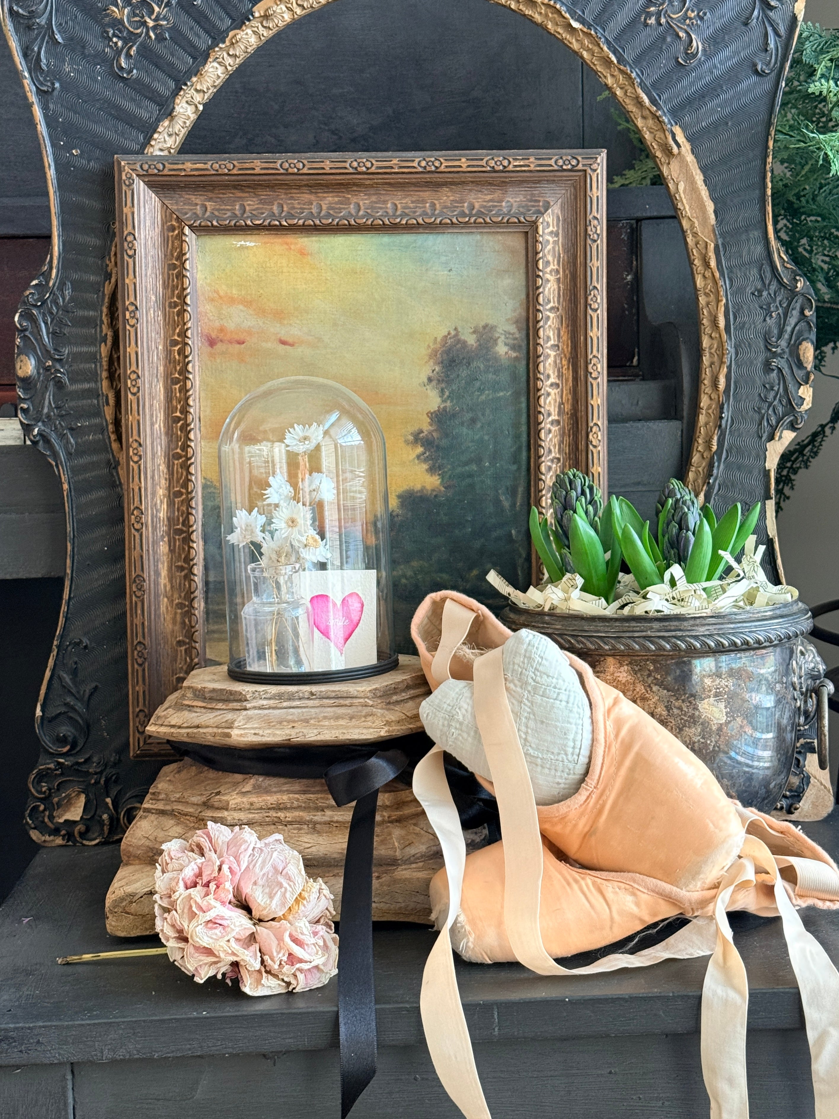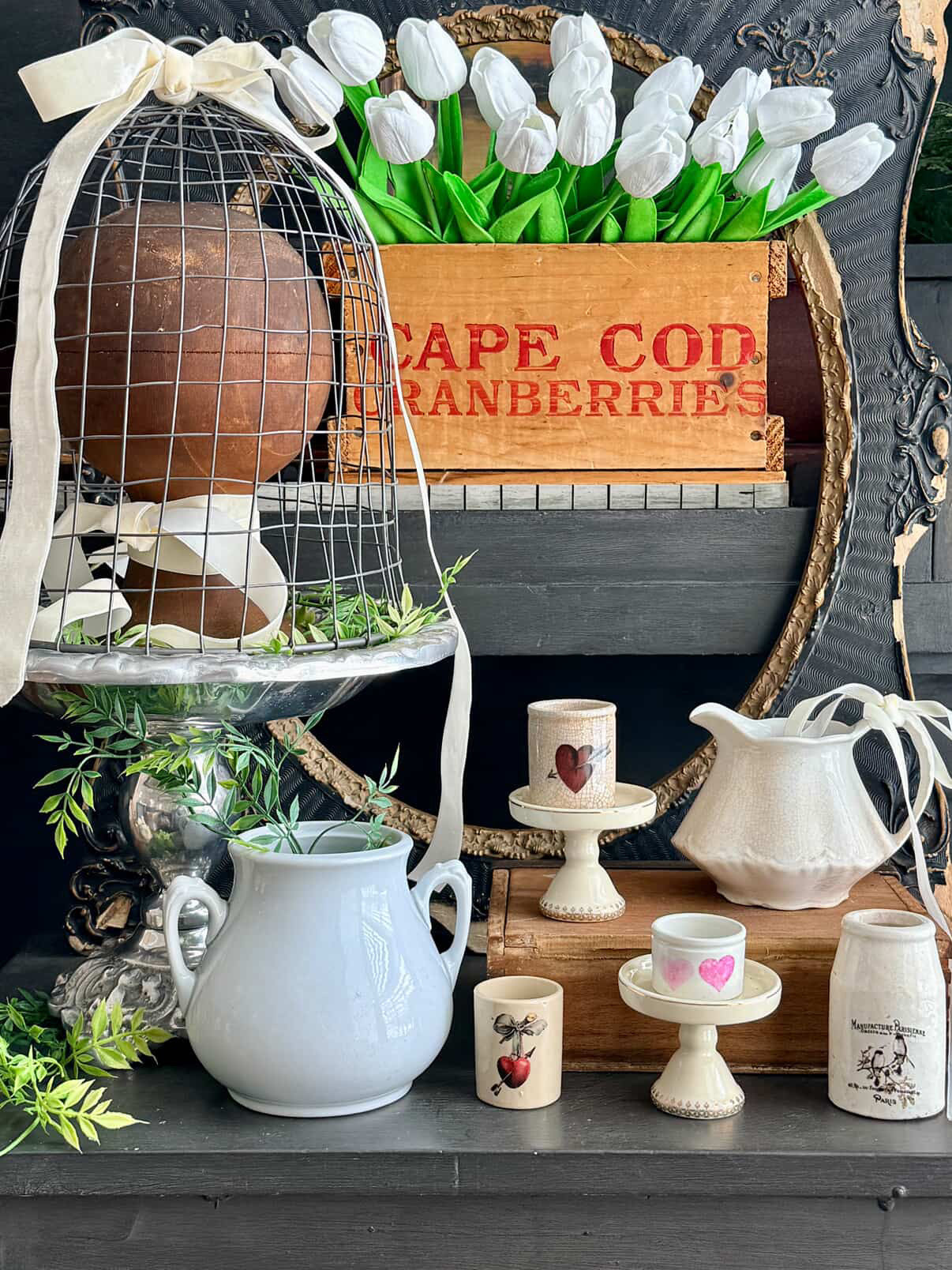 To celebrate the winter season, I’ve added vintage wire baskets, brass candle sticks, sweet cherubs and antique hat stands.