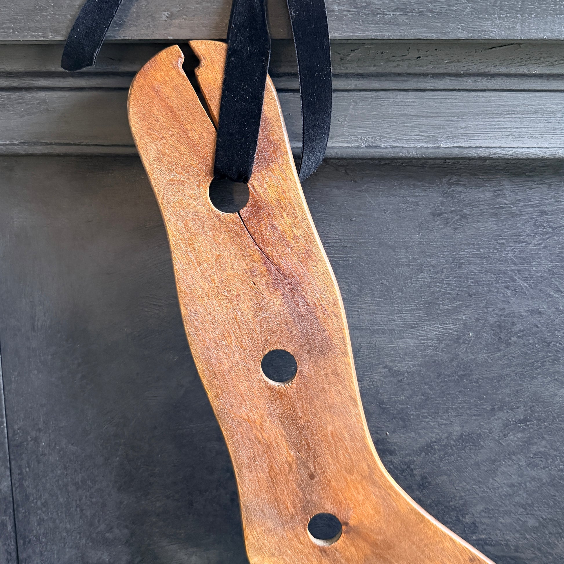 This authentic antique wooden sock form measures 21" in length and features five holes. It showcases a beautiful stained wooden patina, adding to its rustic charm. Please note there is a split at the top.