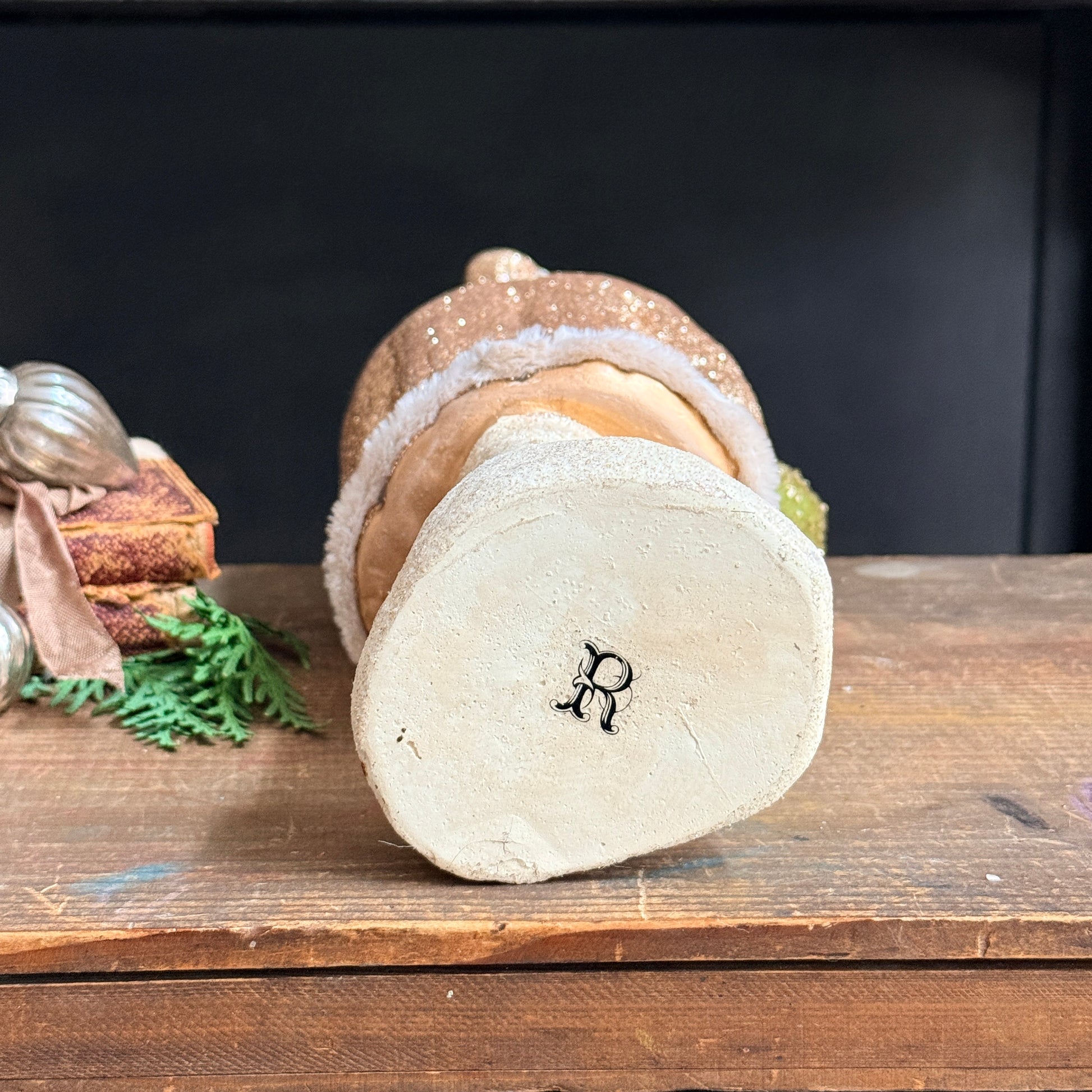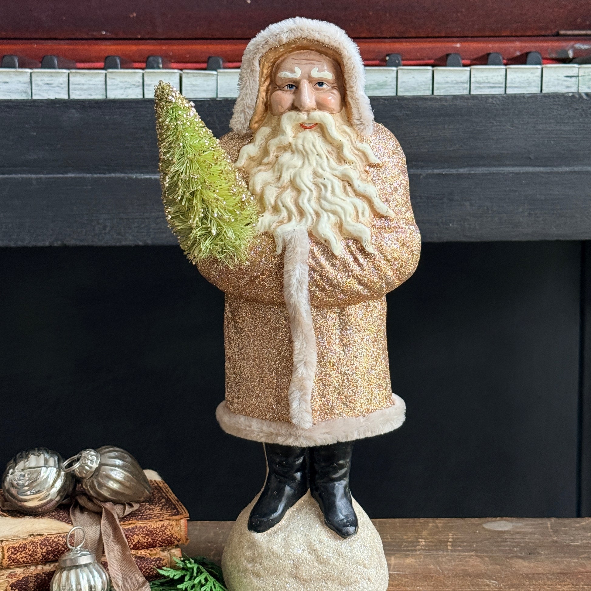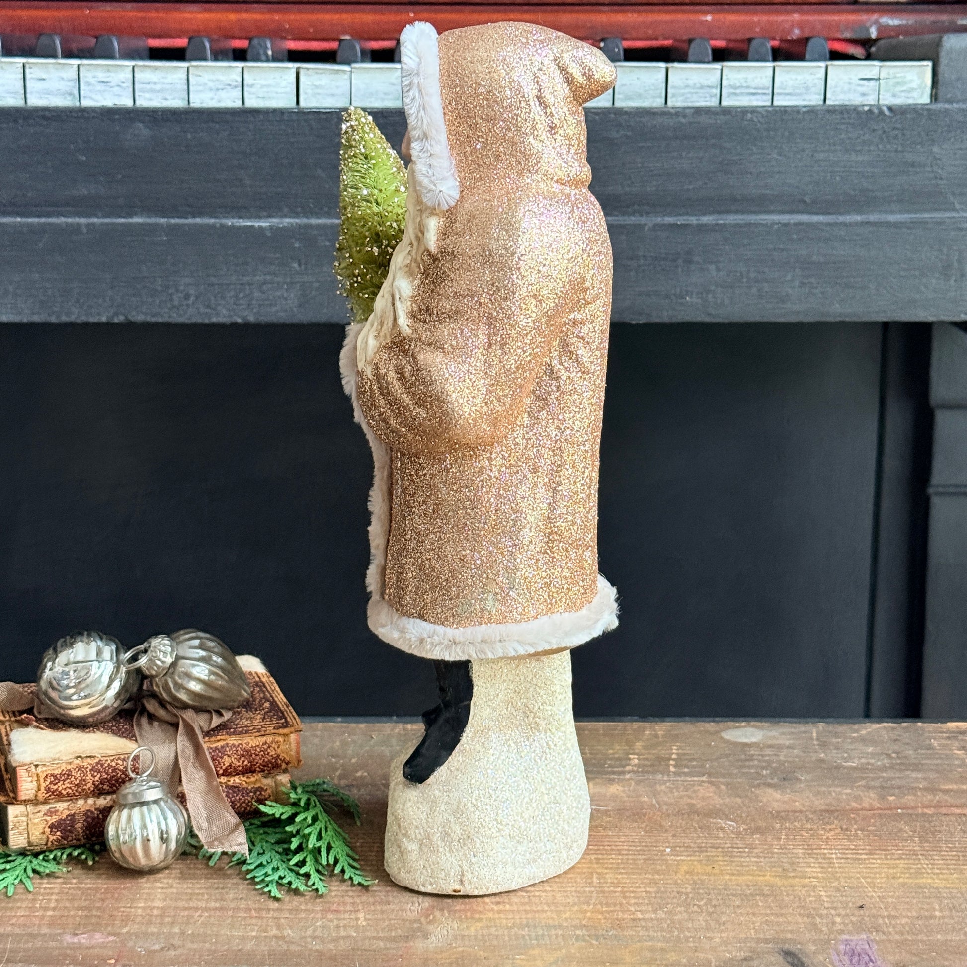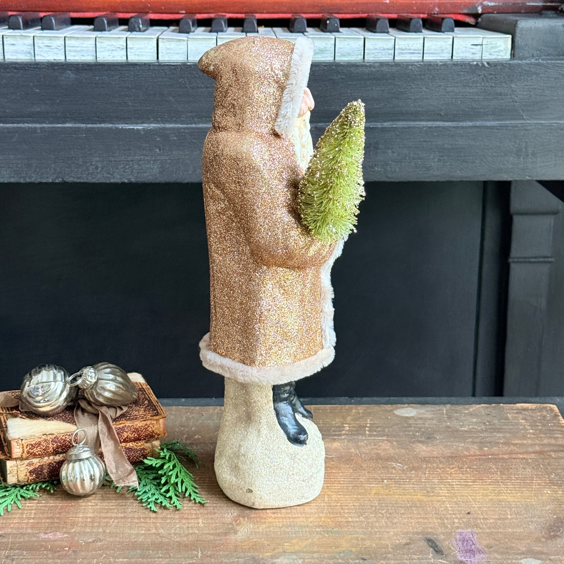 This charming Belsnickle Santa figure features a classic vintage aesthetic crafted from resin. Dressed in a champagne coat with soft chenille trim and adorned with glitter details, he clutches a festive green and gold tree. Perfect for adding nostalgic holiday charm. Newer decor item, unsure of age.