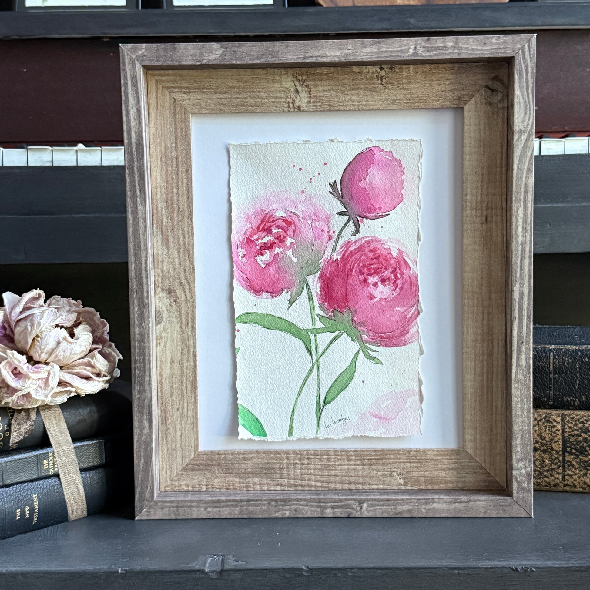 Hand-painted on cold pressed Arches watercolor paper with deckled edges. This piece brings a touch of botanical grace to any shelf, table, or bedside. It makes a lovely accent for spring, but its timeless elegance carries through all seasons—a perfect gift for flower lovers, garden souls, or anyone who adores feminine, nature-inspired art.