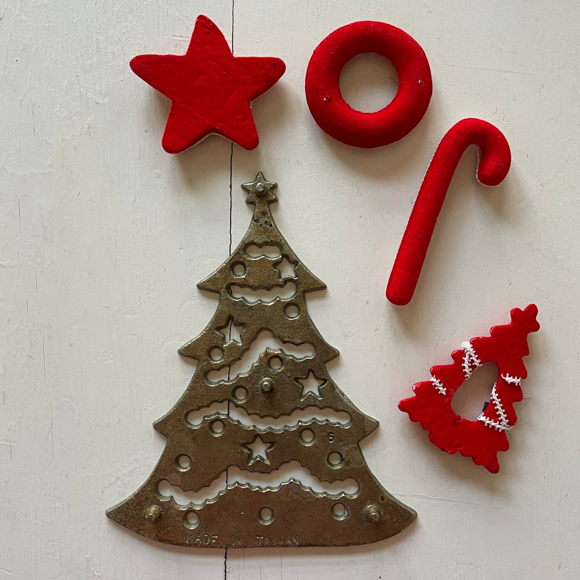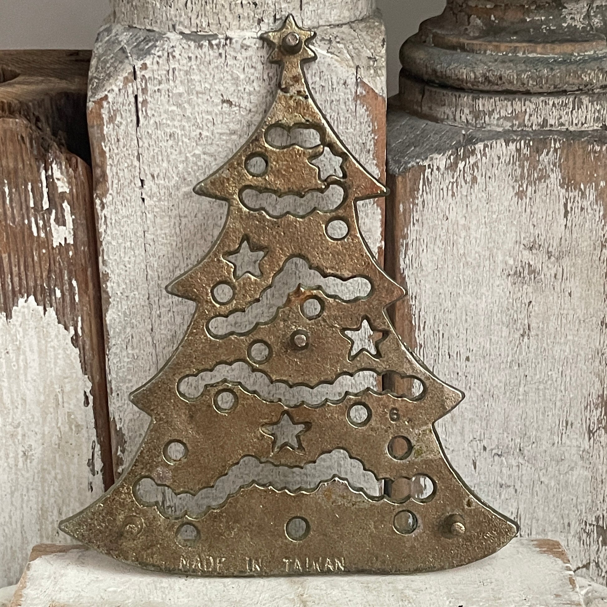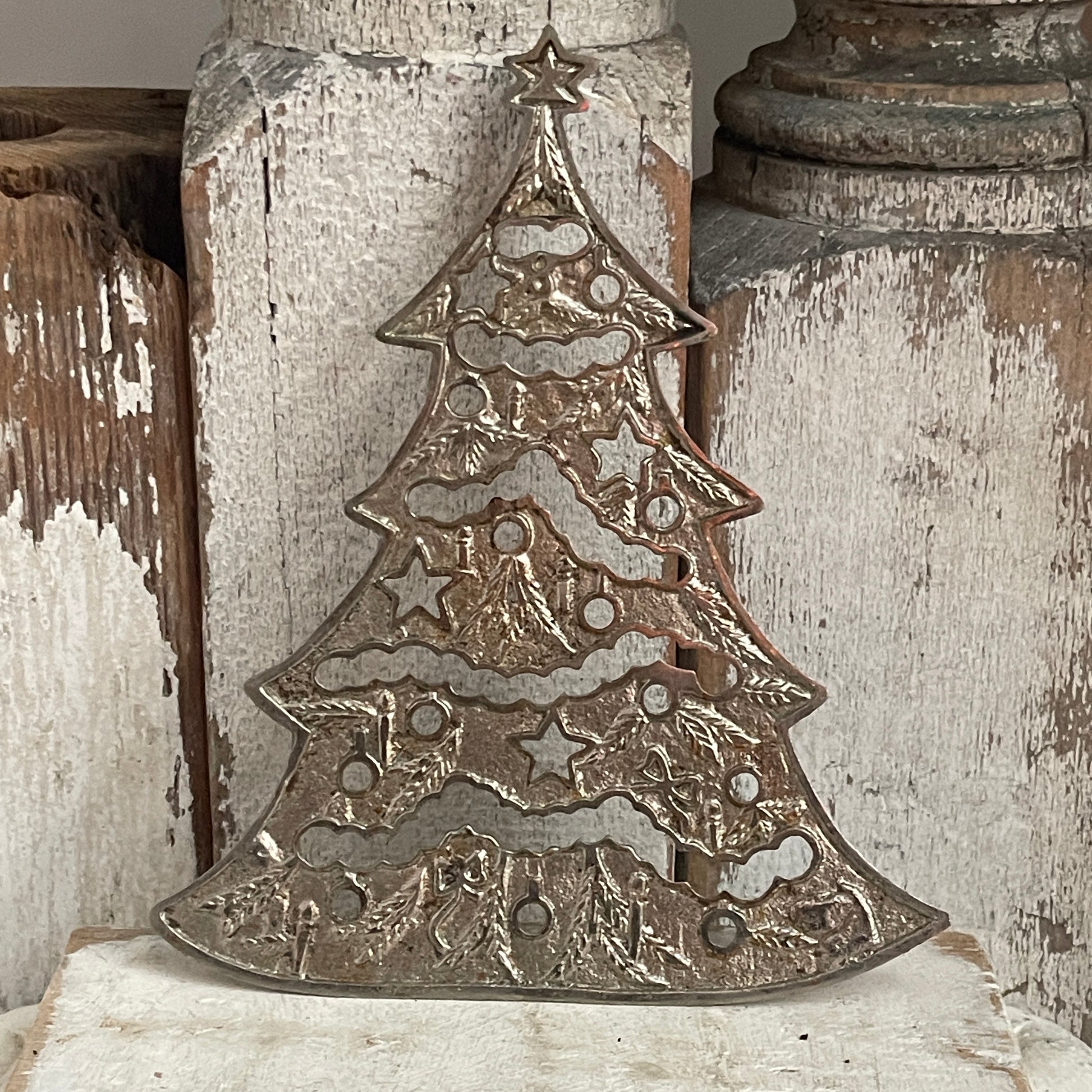 Christmas Tree Trivet. Silver metal on the front and more of a gold color on the reverse side. Made in Taiwan. 8.5” x 7” widest.