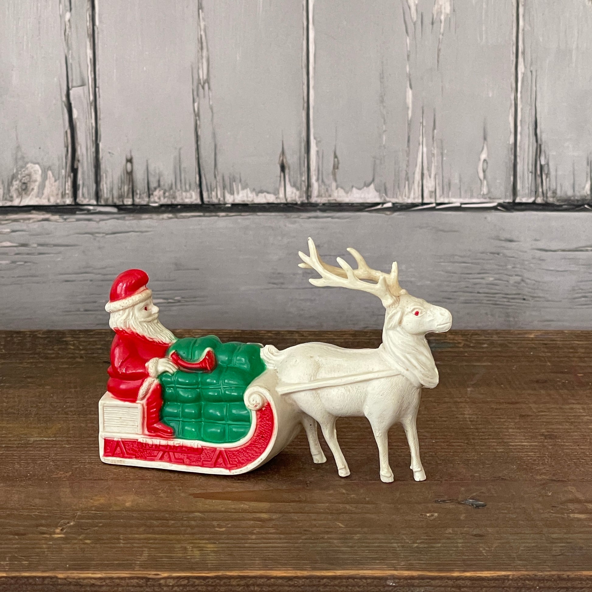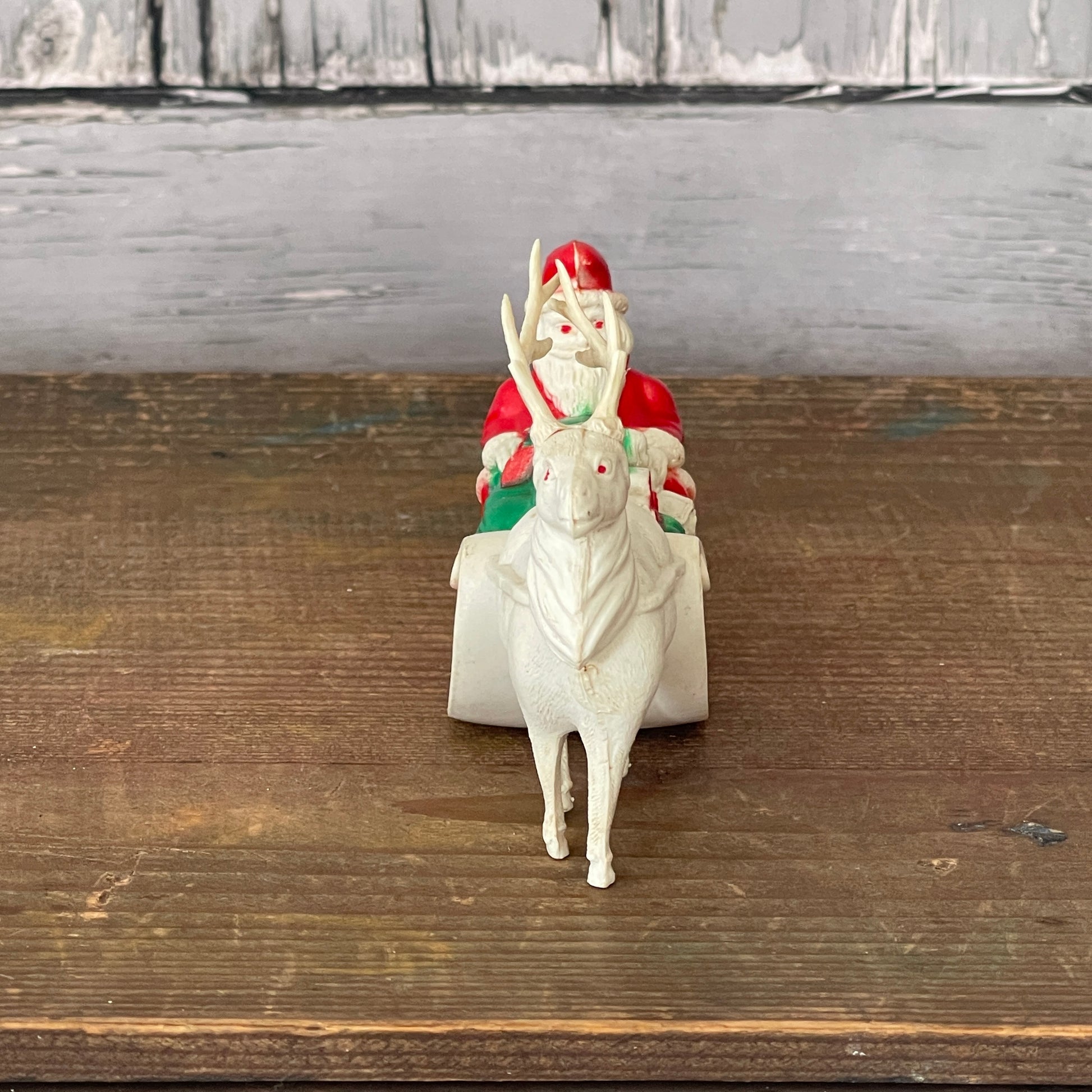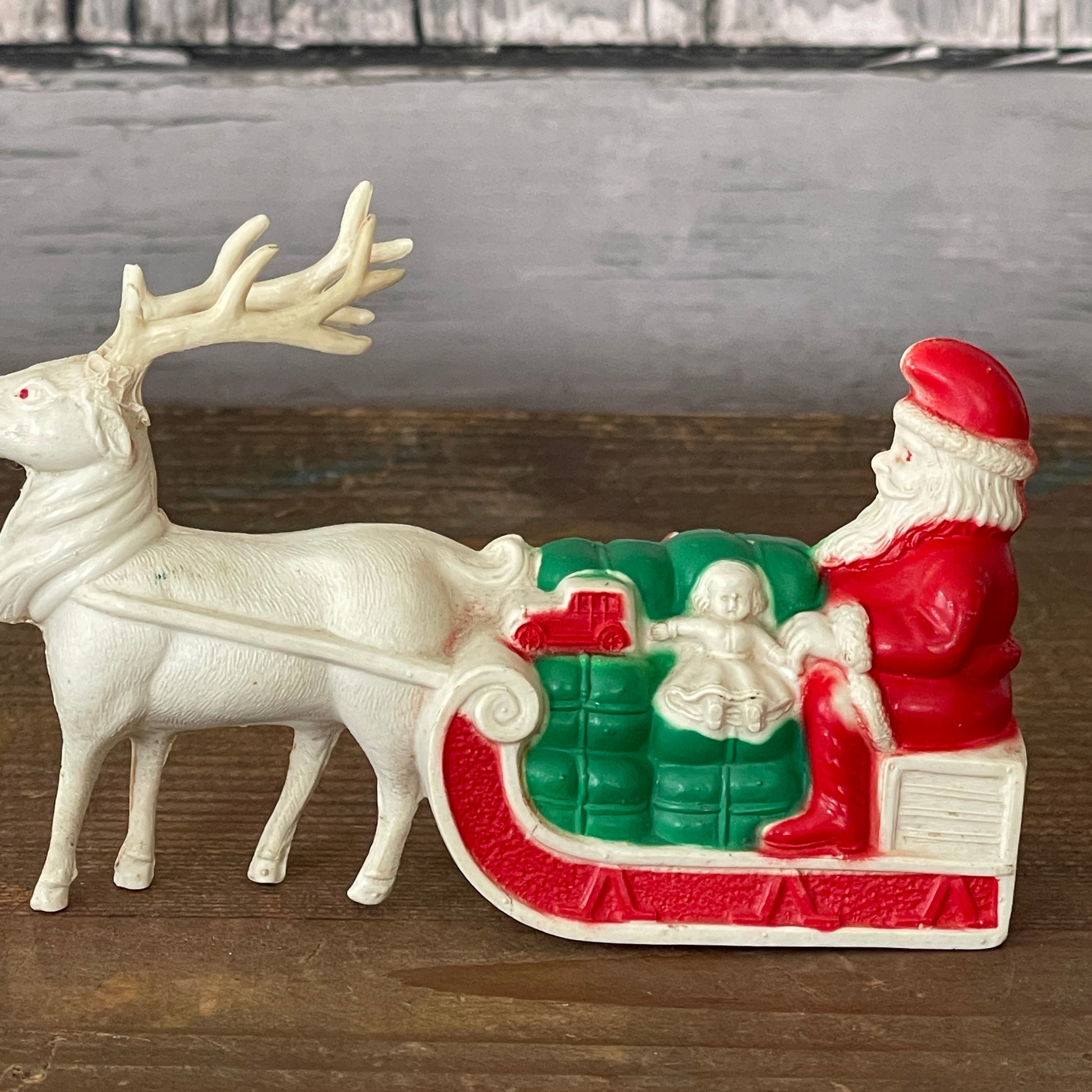 This vintage Christmas figurine made of celluloid showcases Santa in his sleigh filled with toys, along with his trusty reindeer. It boasts vibrant colors and is perfect for collectors.