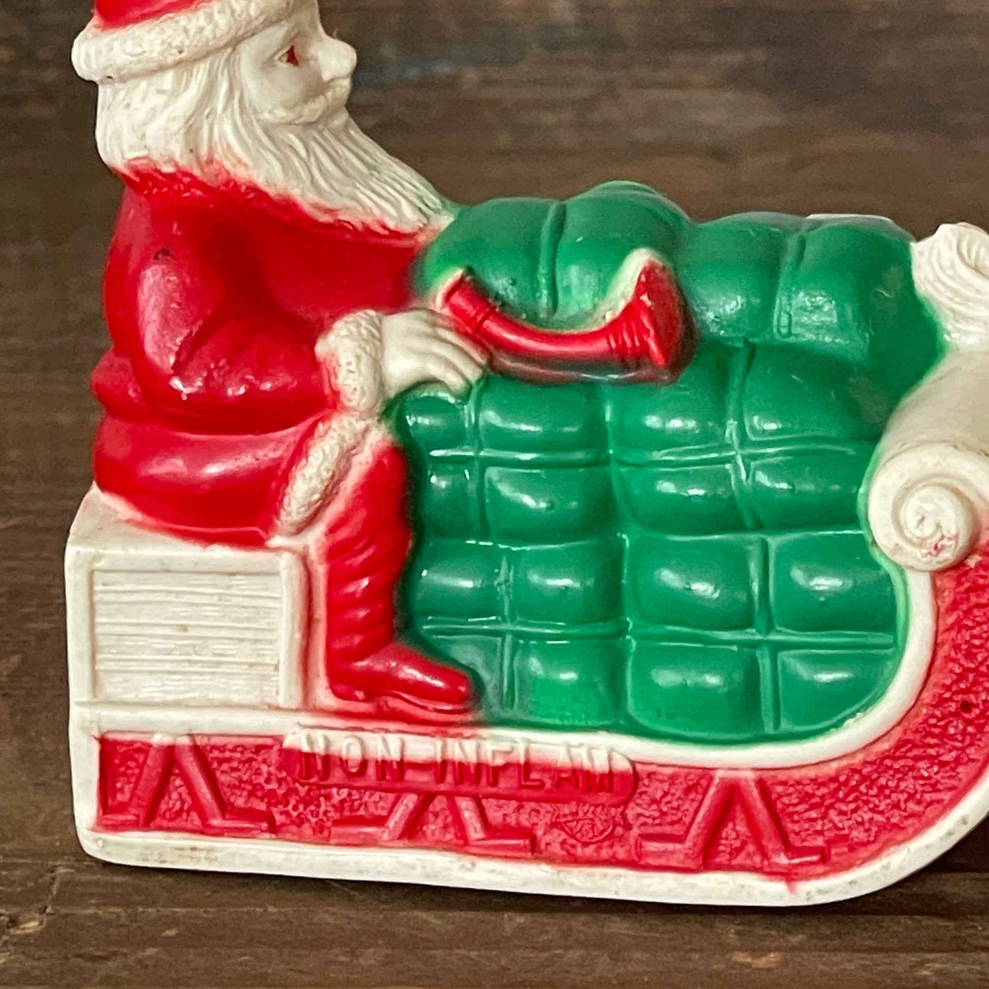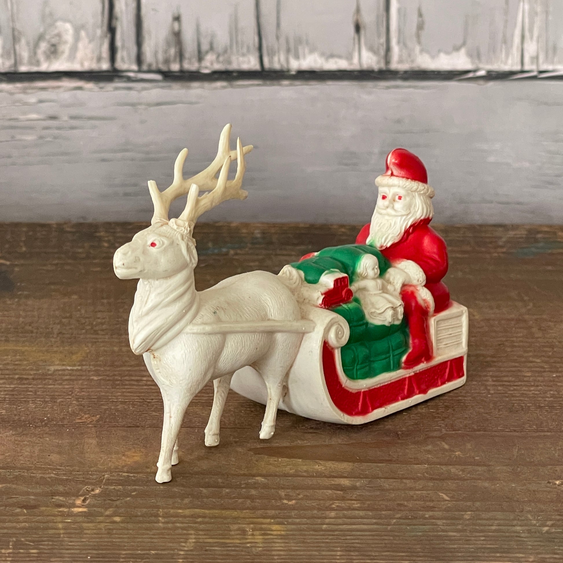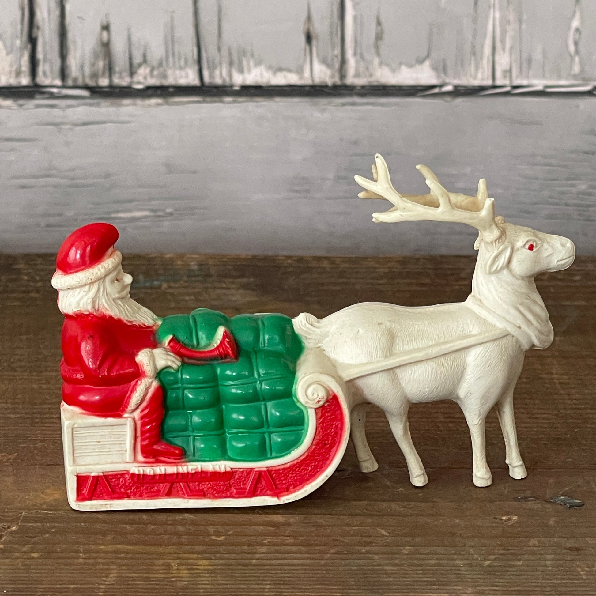 This vintage Christmas figurine made of celluloid showcases Santa in his sleigh filled with toys, along with his trusty reindeer. It boasts vibrant colors and is perfect for collectors.