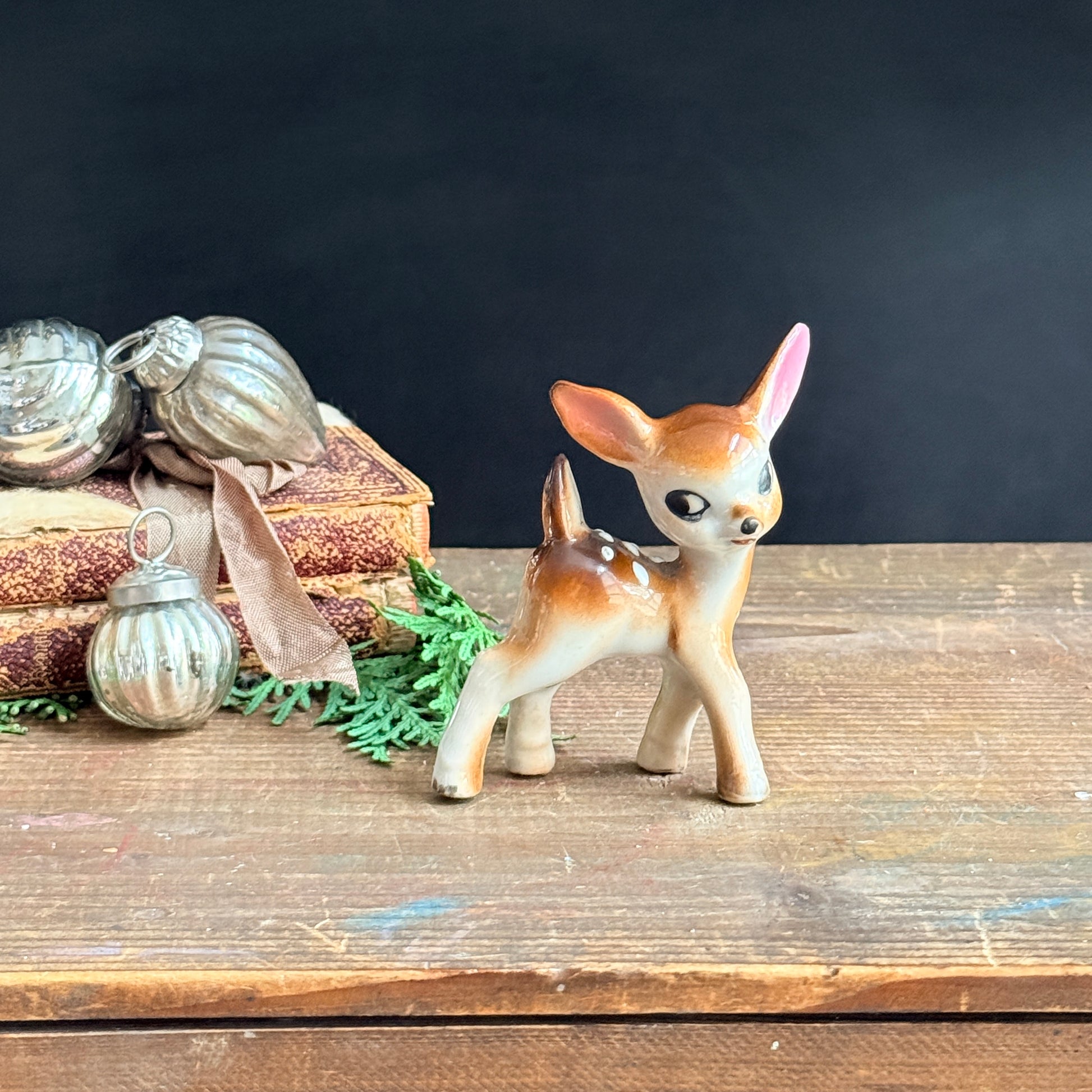 The sweetest vintage standing spotted fawn. Ceramic and glazed. Marked Japan, mid-century.
