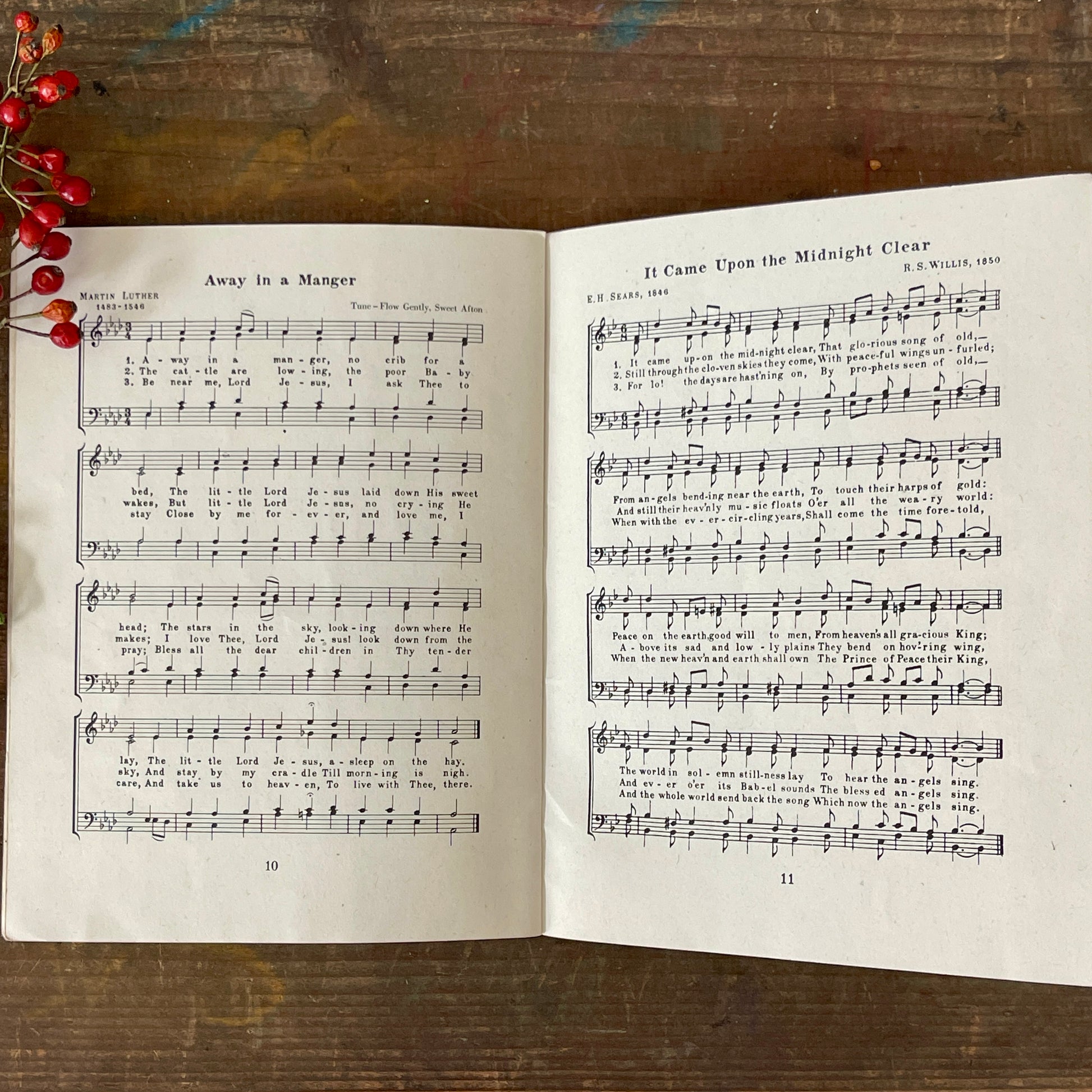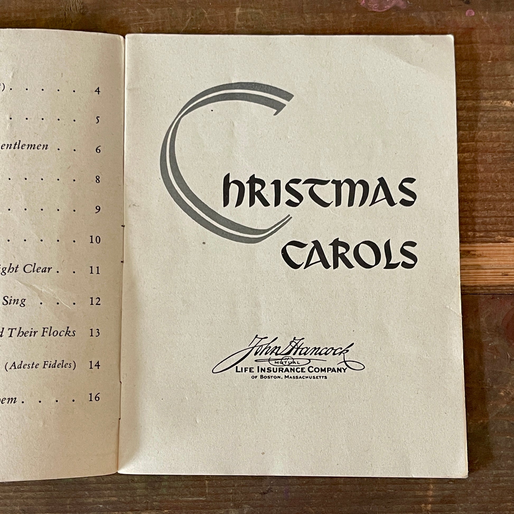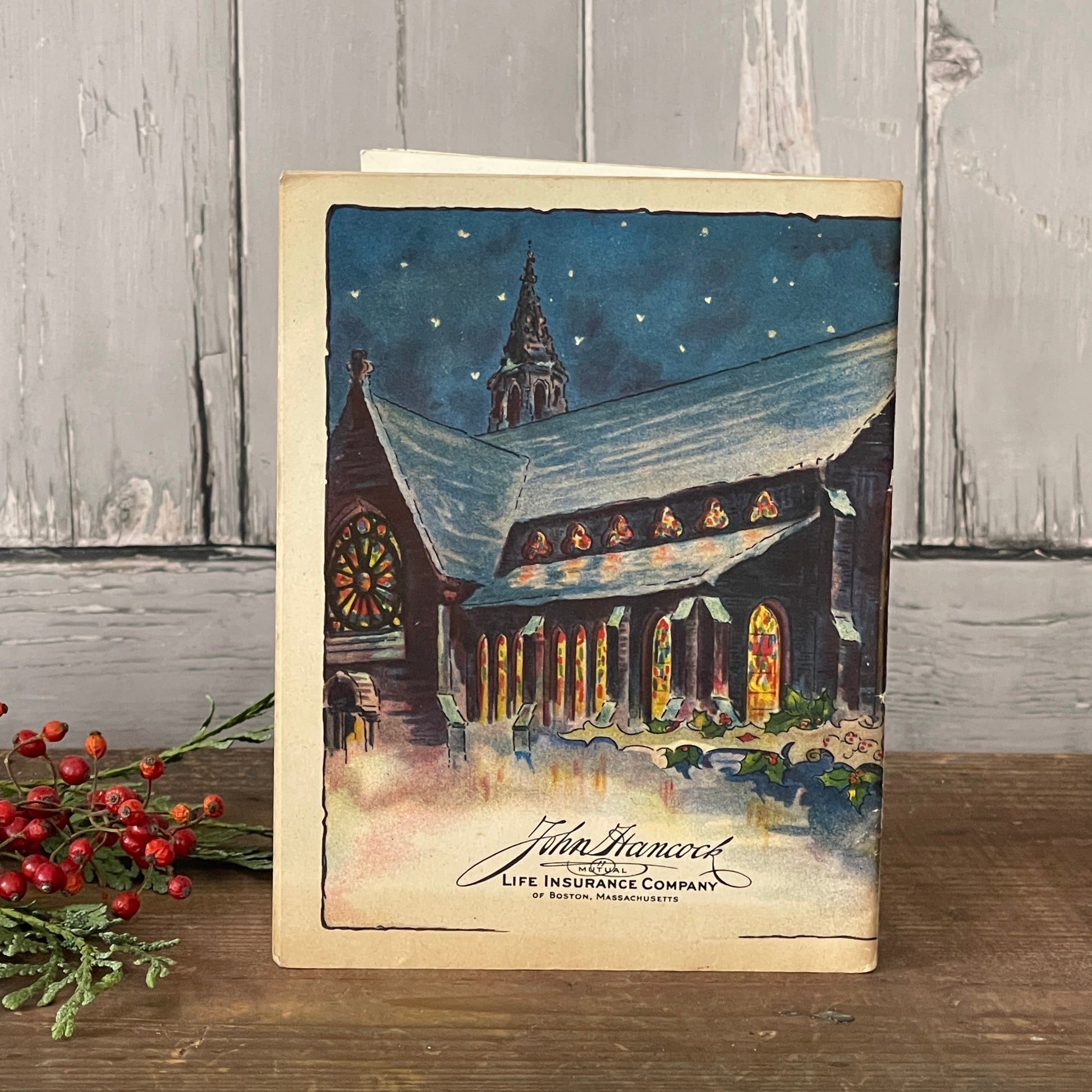This booklet, presented by John Hancock Life Insurance Co., features a collection of 11 Christmas carols printed on 16 pages. The cover boasts a beautiful depiction of a colorful church, vibrant stained glass, and a wintery scene.