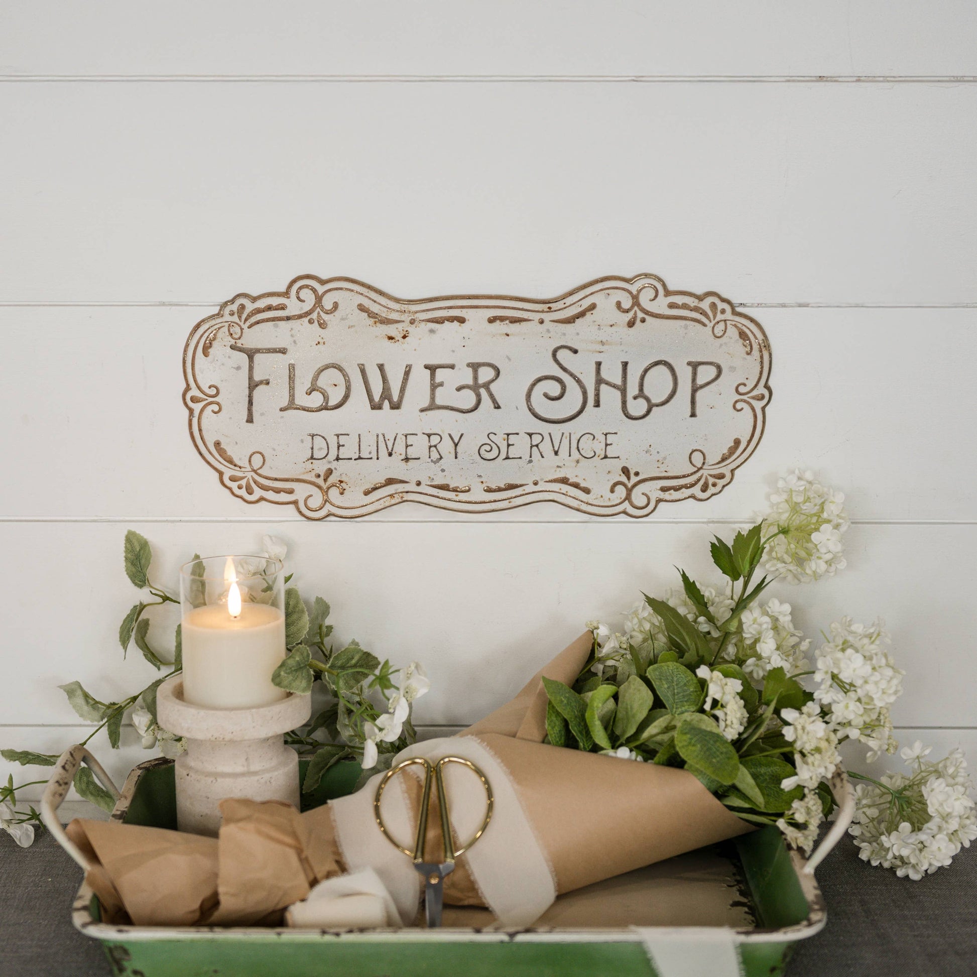 Off white metal Flower Shop Sign with brown typography. Rounded edges with scrool detail and a rustic faux finish. This would be adorable on your porch, sunroom, garden shed or potting station. Hang with attached triangle hook. New Decor item.