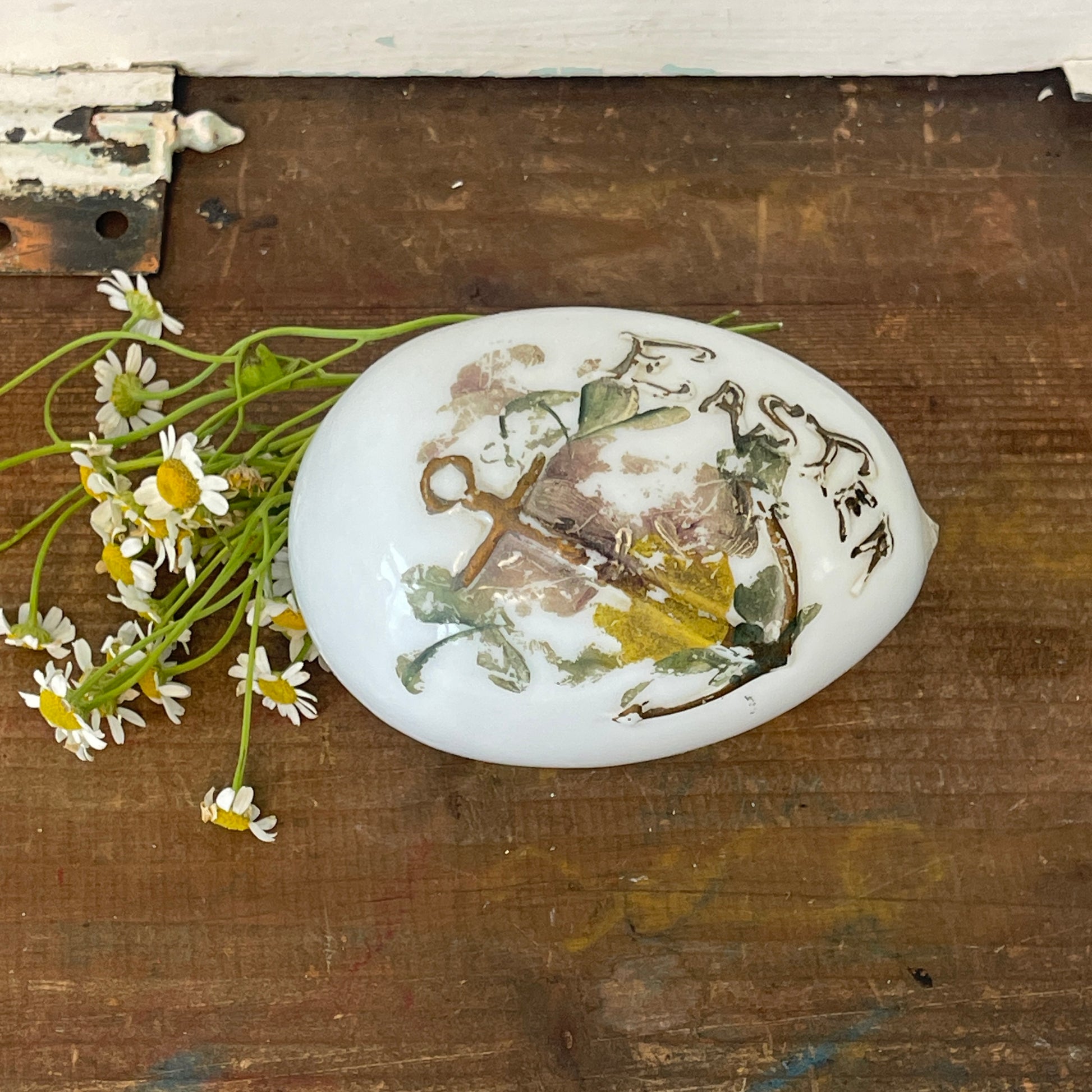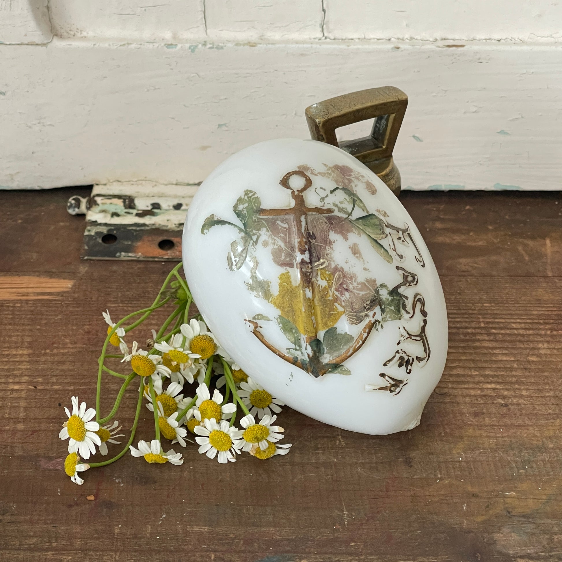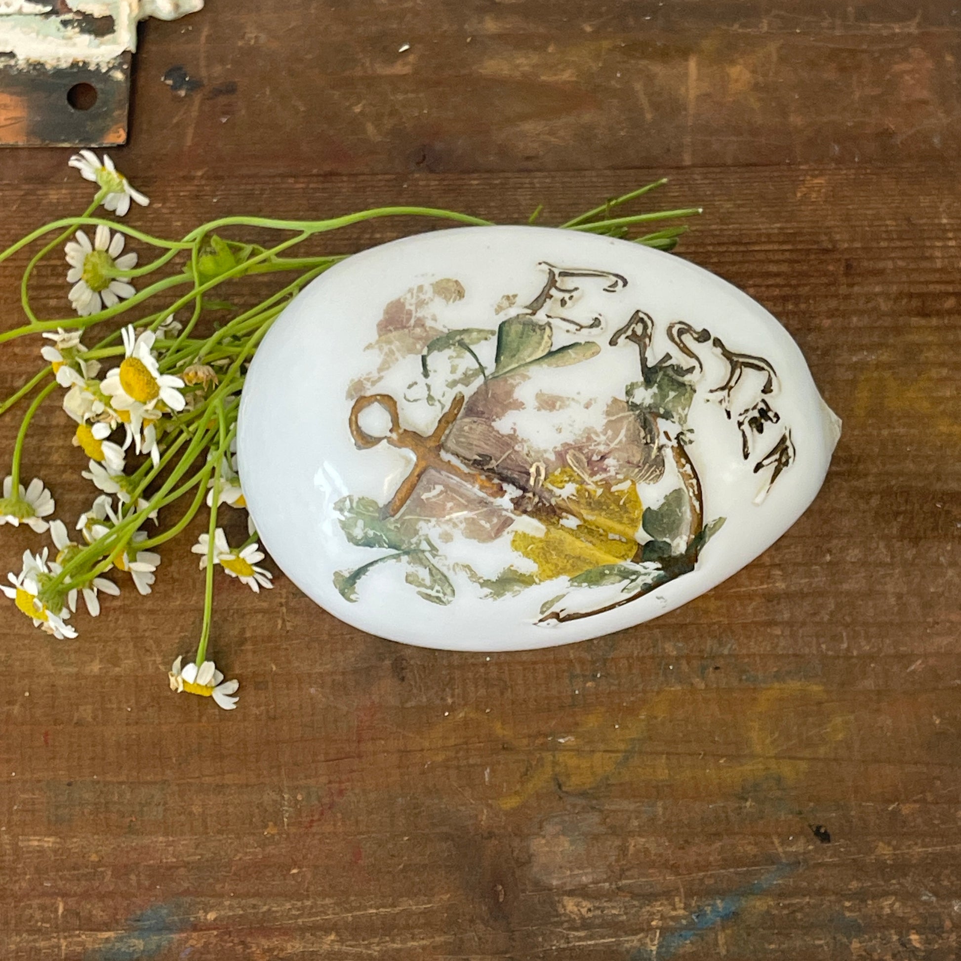 Victorian Era, antique glass Easter Egg. Embossed with the word Easter and an Anchor painted in shades of green, gold and brown.