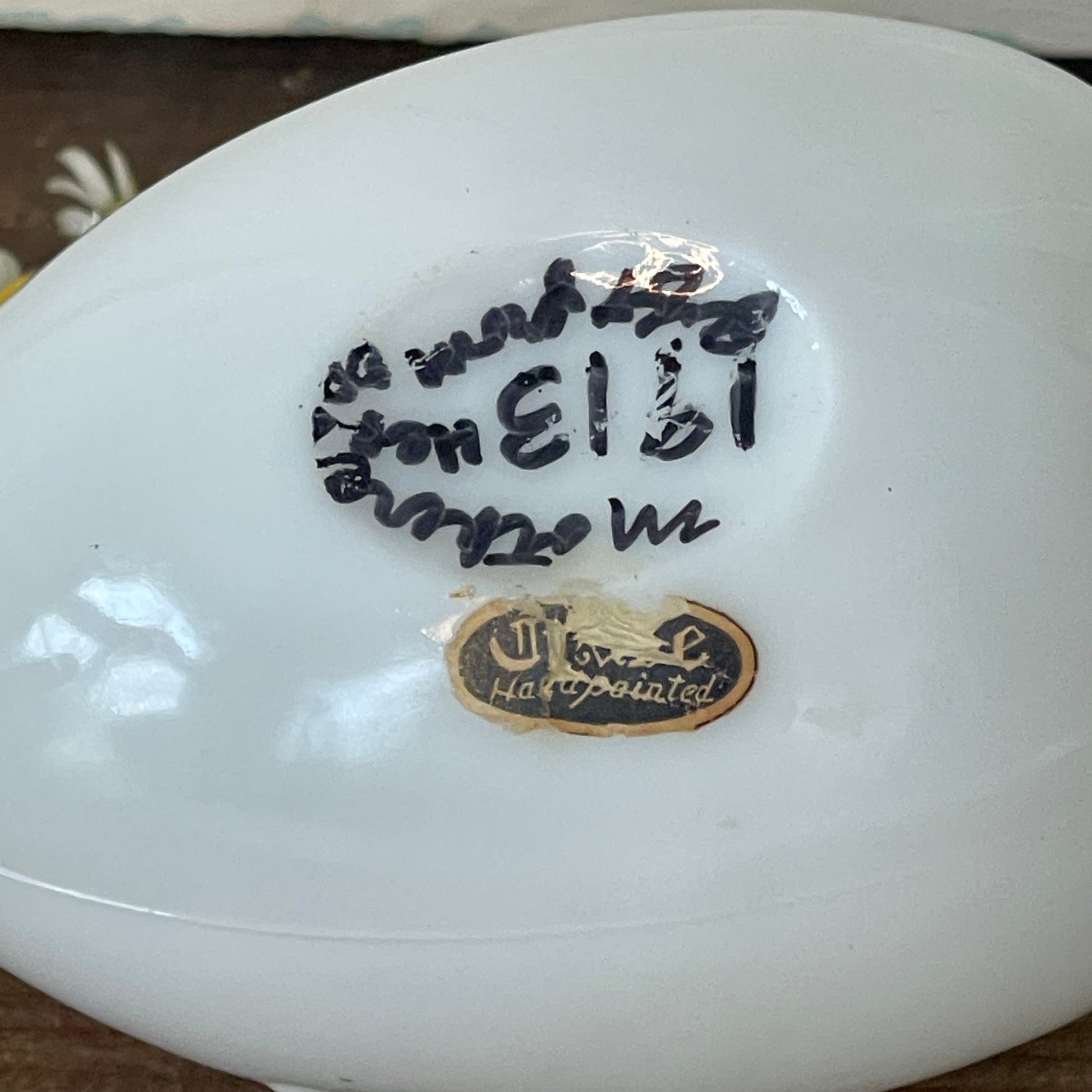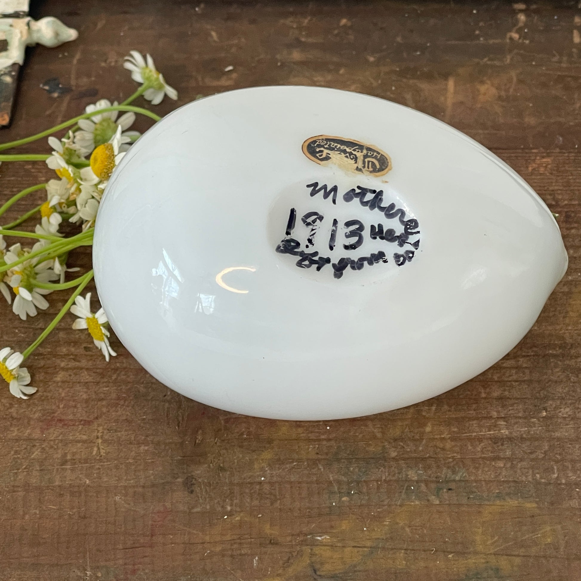 There is a makers sticker, which is partially missing as well as handwriting inscription and date of 1913. Egg sits on a depressed area on bottom of egg.