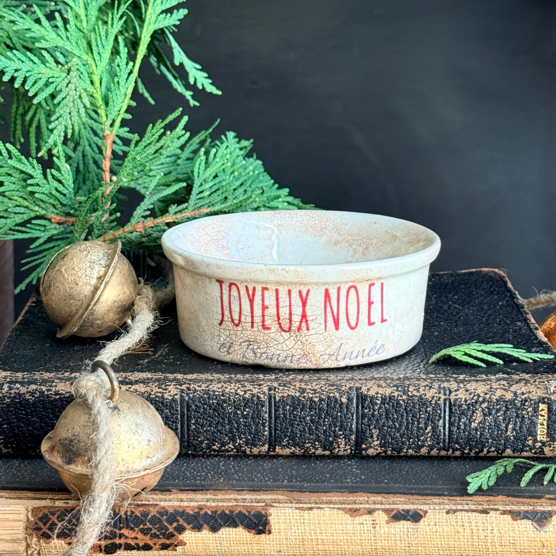 Timeless antique ironstone shallow dish has been adorned with a new graphic transfer "Joyeux Noël" in red with a 25 in the bottom of the dish. Perfect trinket dish for storing and displaying your favorite collections.