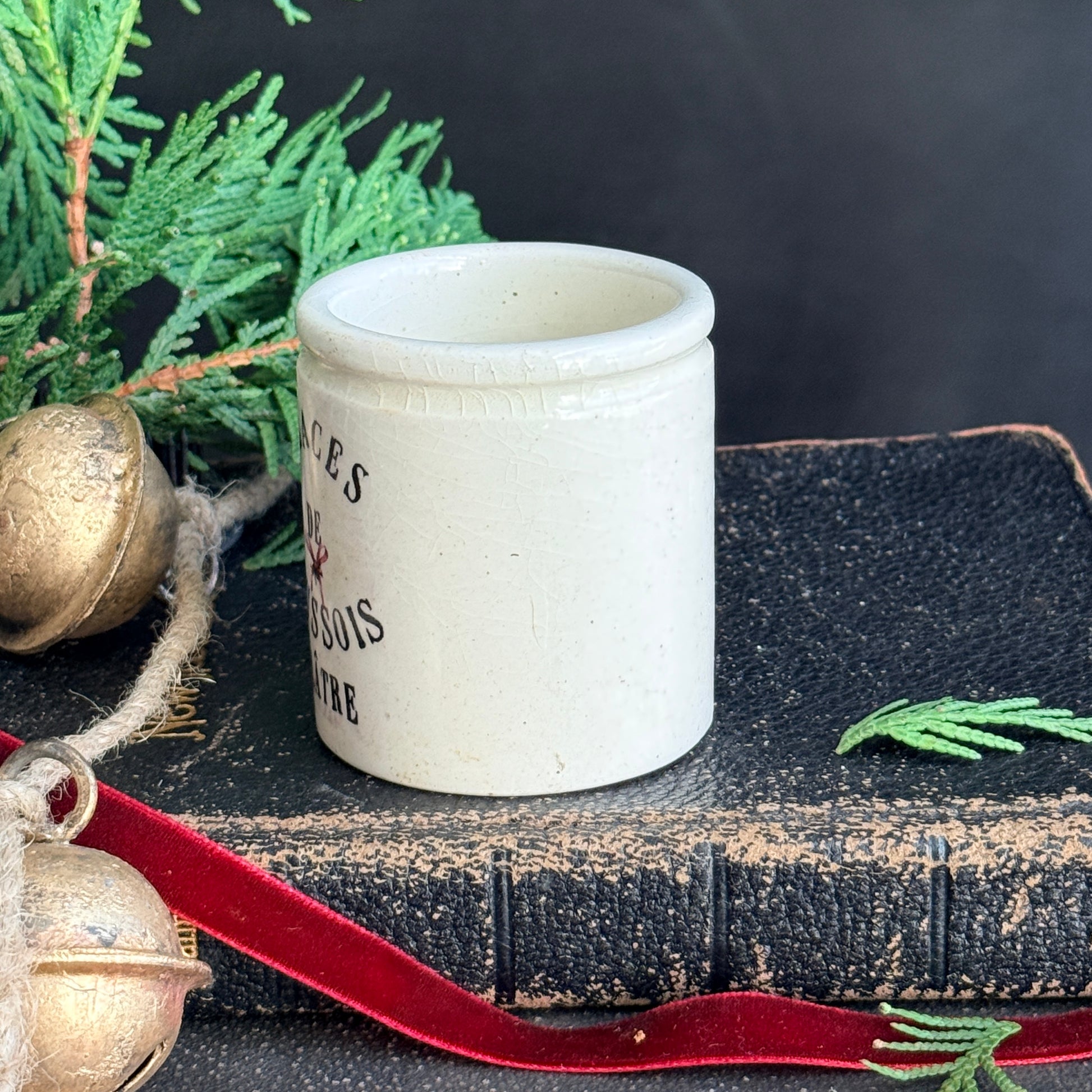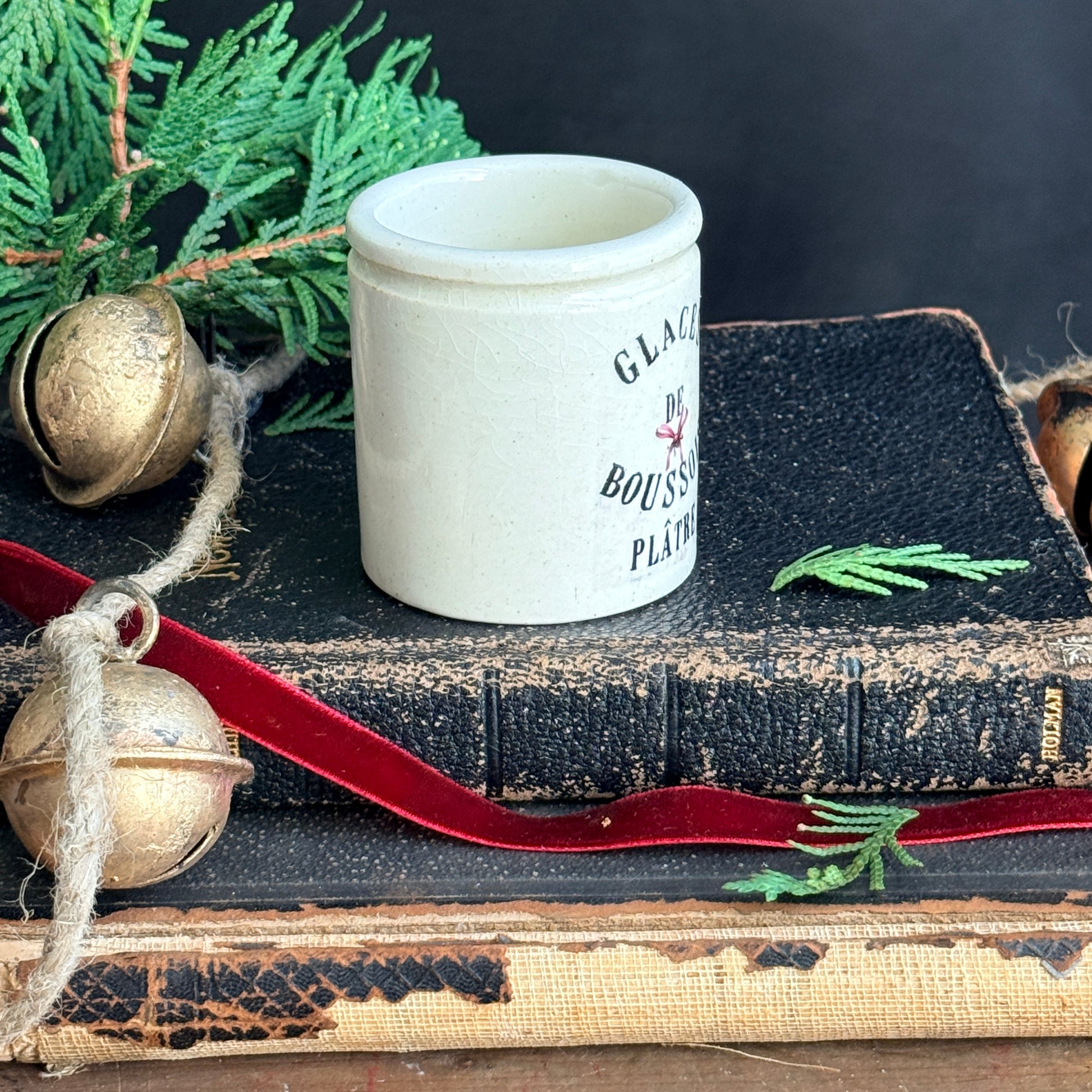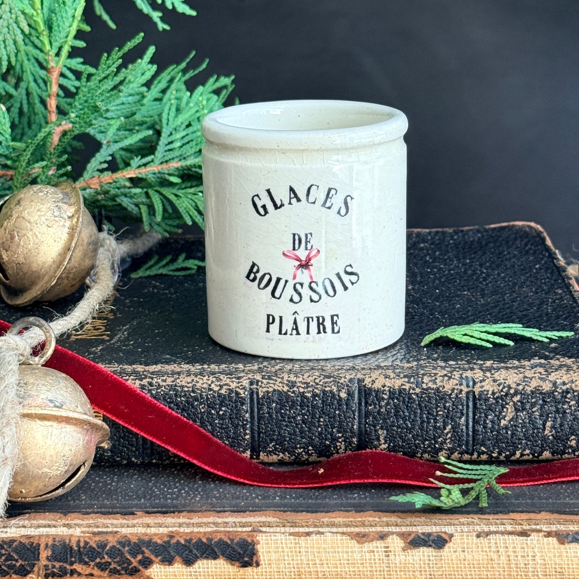 Timeless antique ironstone crock has been adorned with a new graphic transfer "Glaces De Boussois Plâtre". Makes a darling pot for storing small treasures and displaying your favorite collections.