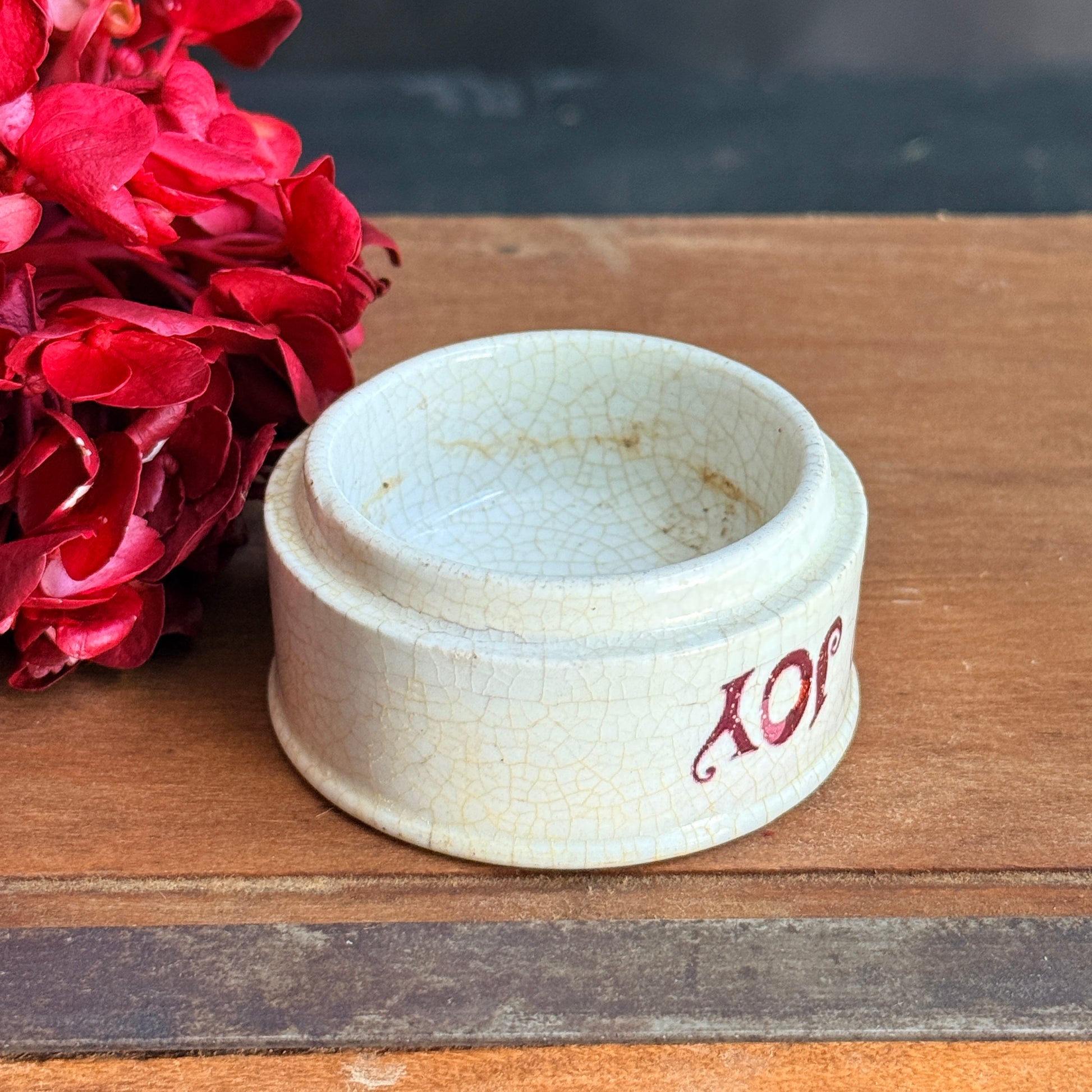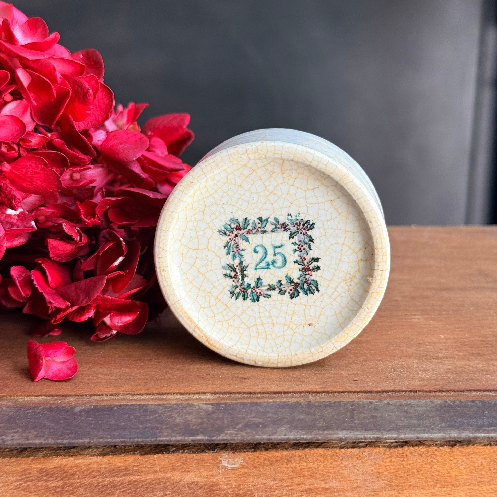 Timeless antique ironstone ointment pot cleverly transformed into a riser. It features a newly applied graphic appliqué, "25" surrounded in a holly berry frame and "Joy Joy Joy" in dark red. Perfect for stacking and displaying your favorite collections.