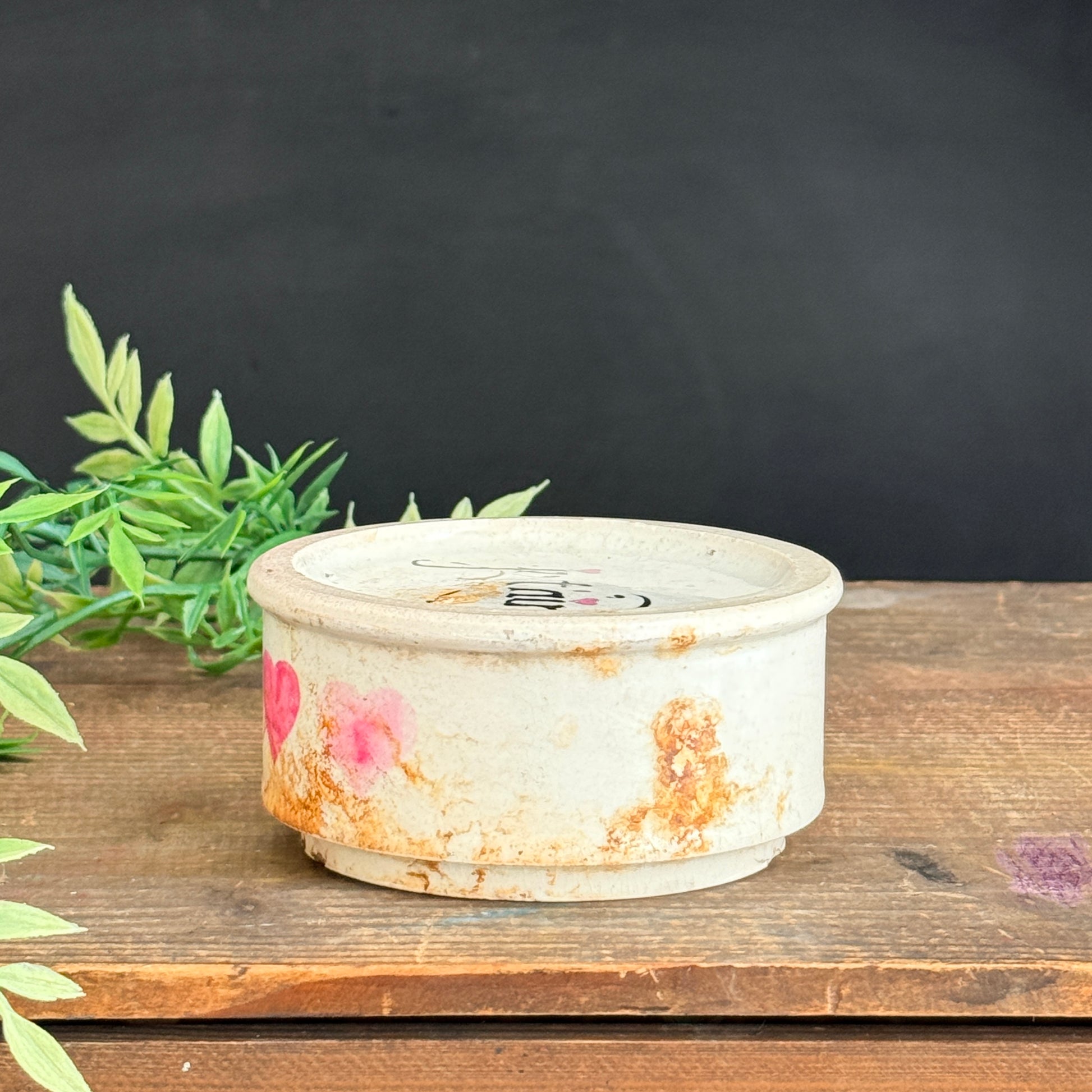 Antique Victorian pots that have been enhanced with beautiful, one-of-a-kind graphic images and typography. These are limited editions, graphics and pots are likely to change according to availability. Graphic is a permanent transfer that has been baked on to the pot.
