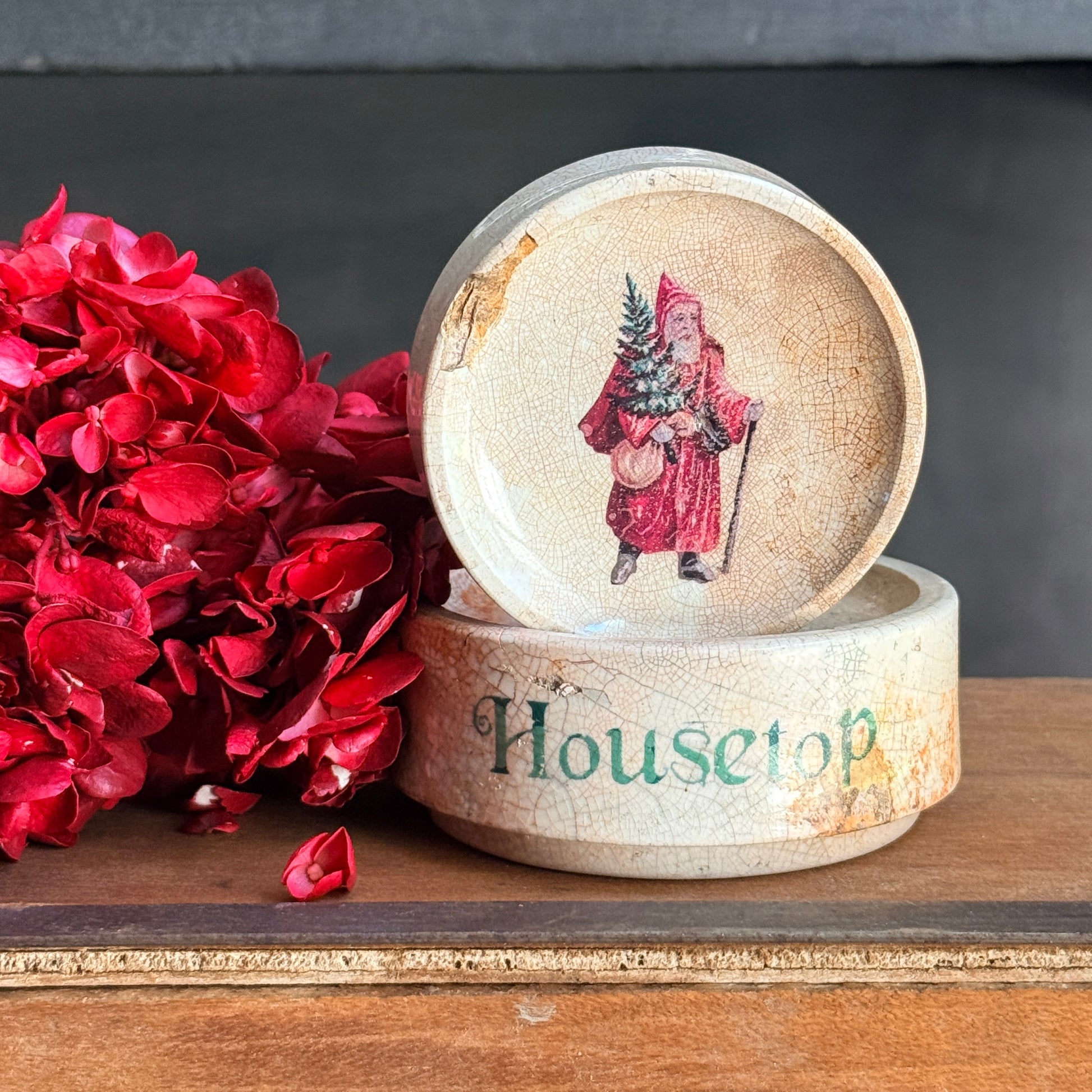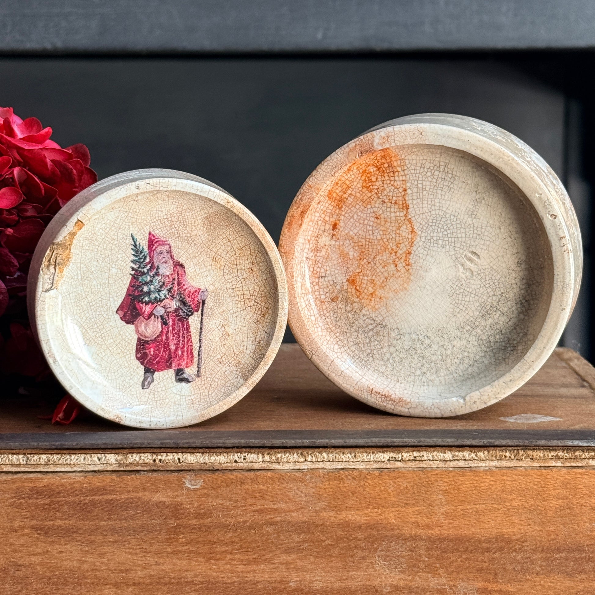 Darling set of two ironstone risers decorated with a charming Christmas Graphic. "Up on the Housetop" in green as well as Father Christmas on the top riser. Beautiful staining and crazing throughout.