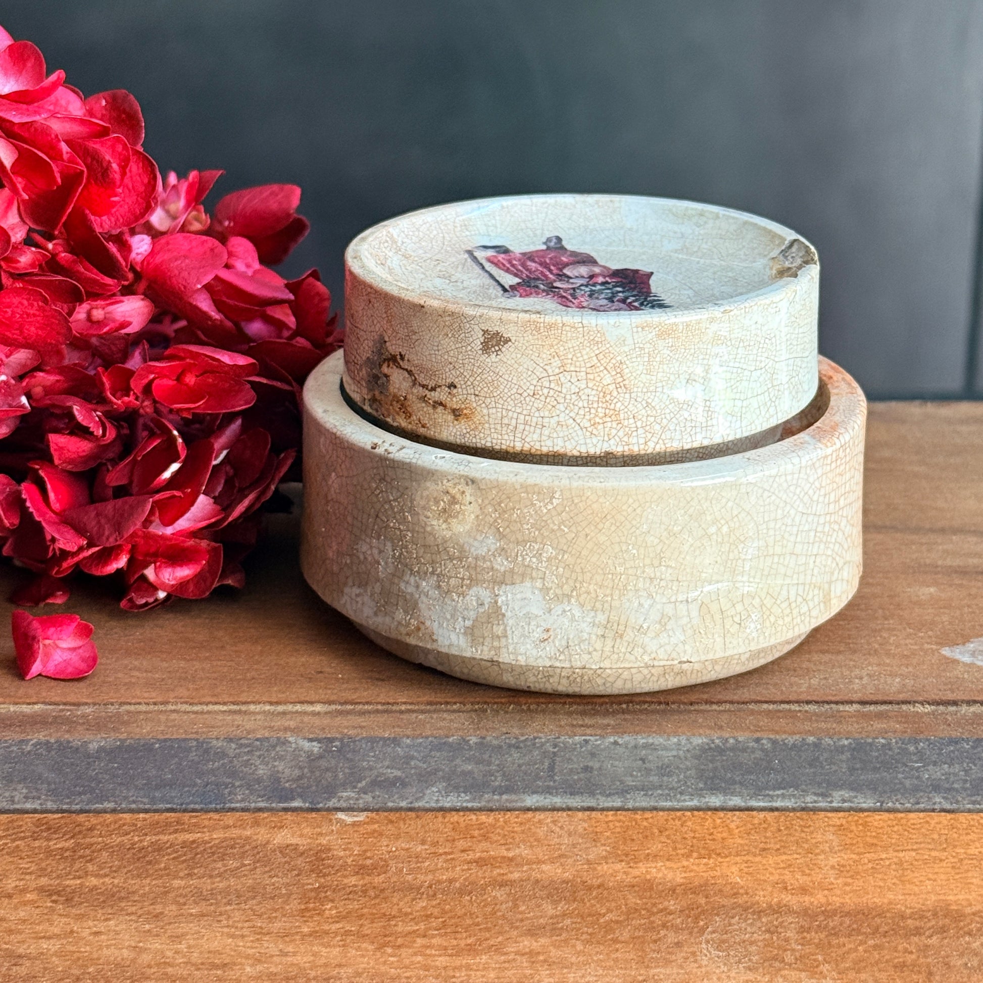 Antique Victorian pots that have been enhanced with beautiful, one-of-a-kind graphic images and typography. These are limited editions, graphics and pots are likely to change according to availability. Graphic is a permanent transfer that has been baked on to the pot.