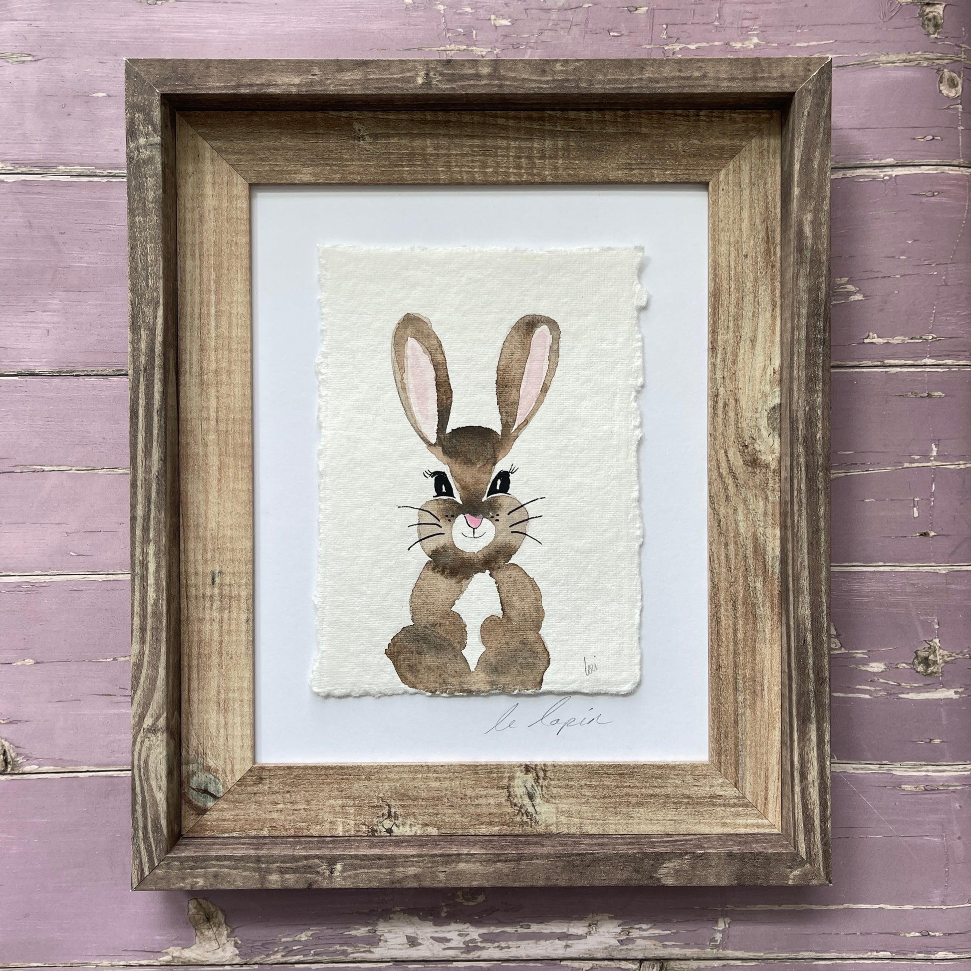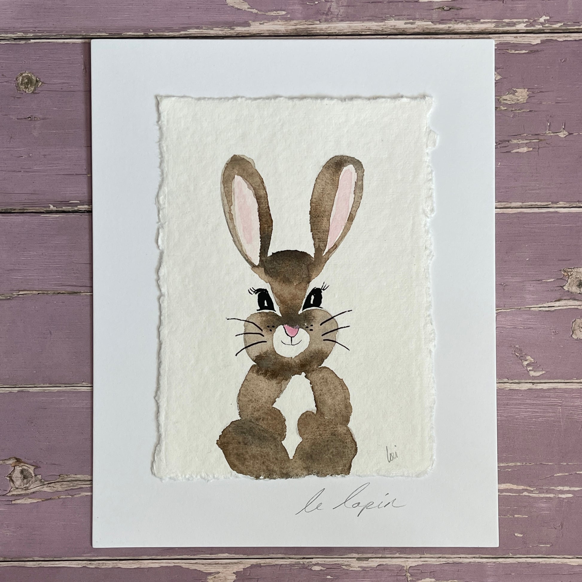 Add charm and whimsy to your space with this one-of-a-kind bunny, Le Lapin. I have hand painted this in watercolor on a 5" x 7" 400 gram deckled-edge cotton paper and mounted on a 8" x 10" white mat board.