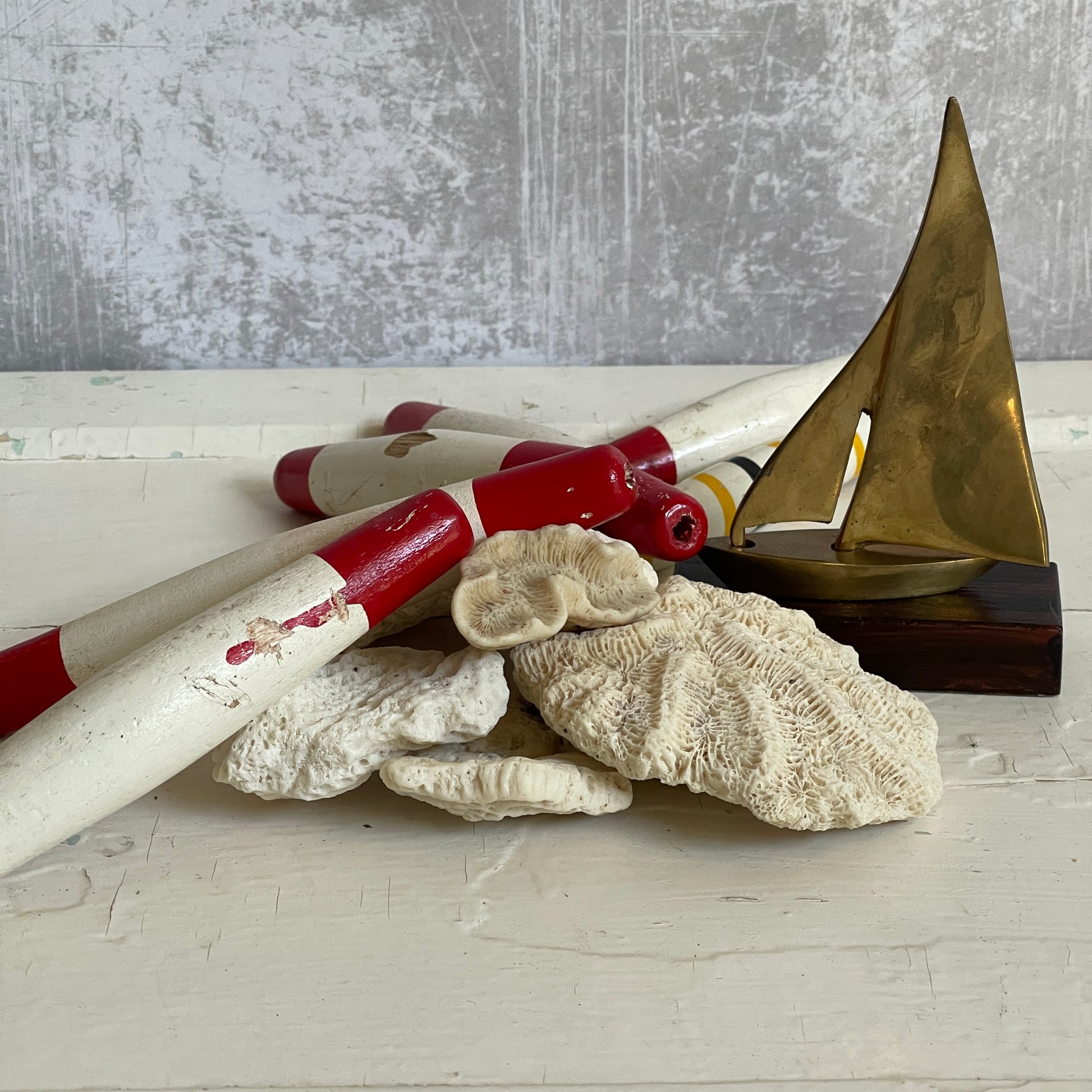 Discover a unique centerpiece for your theme room with Let's Sail Away. Vintage items in this bundle include a boat sculpture, bobbers, and coral. Create a nautical atmosphere for any ocean-inspired space.