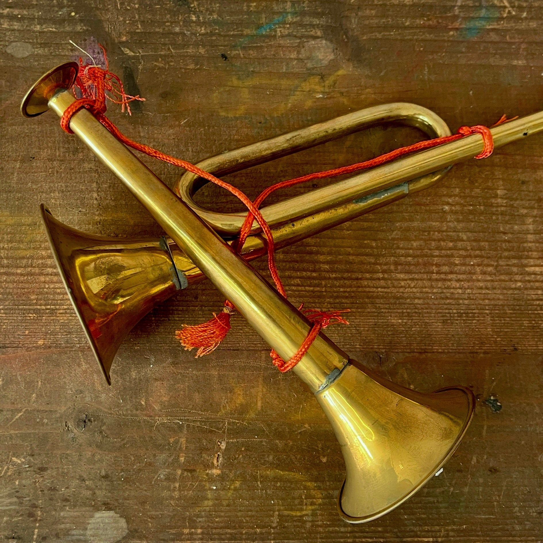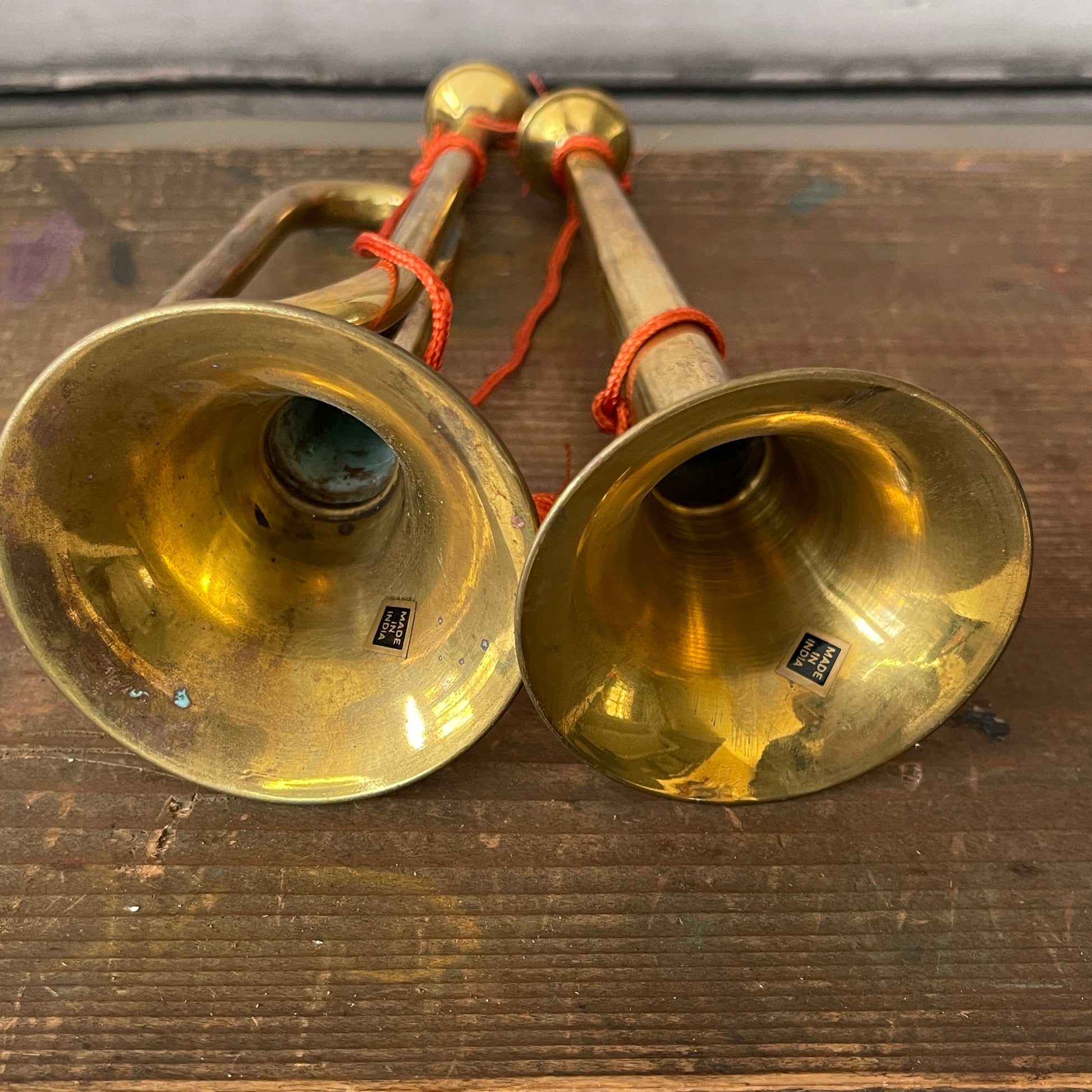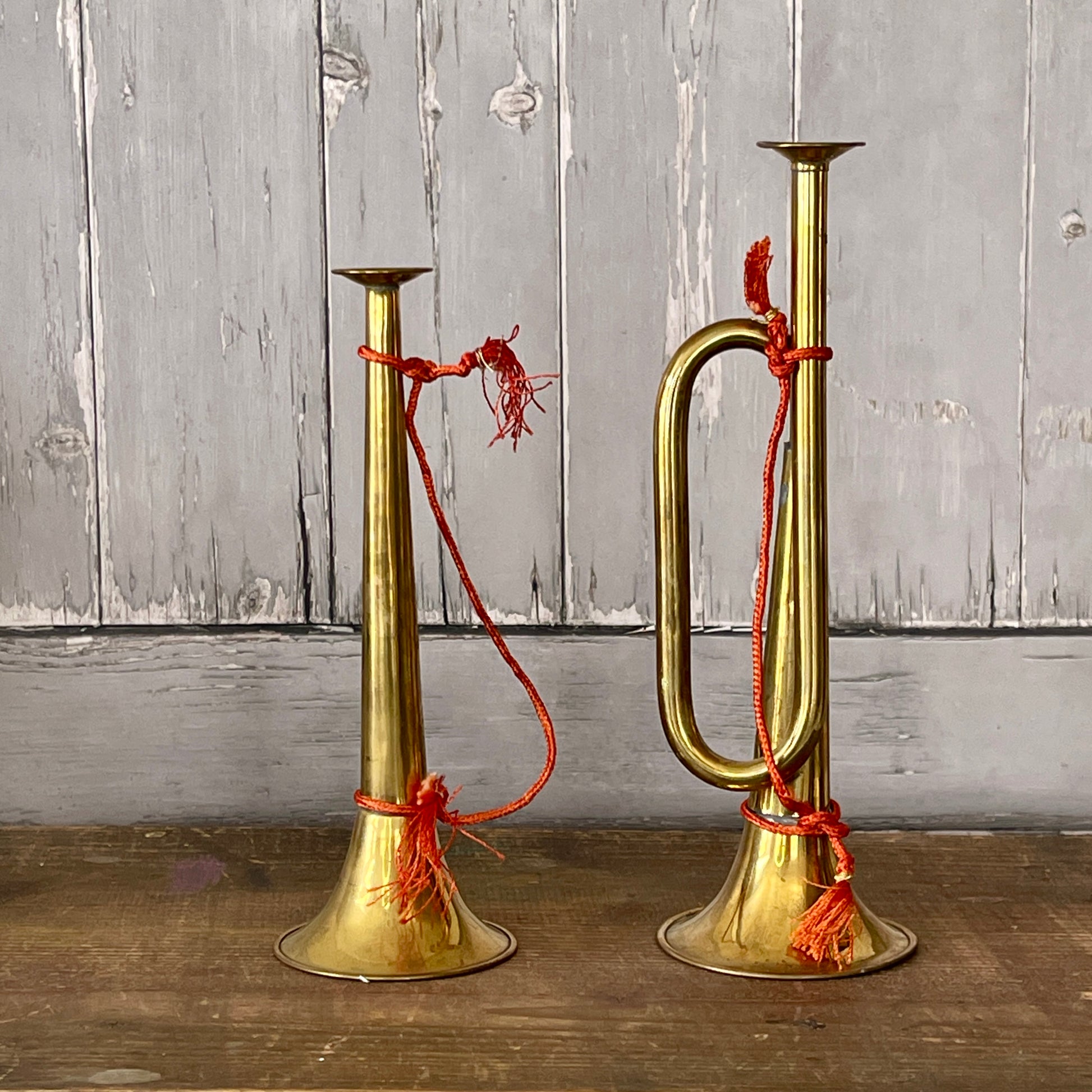 This set of decorative vintage horns features a red cord and tassels, making it a festive addition to Christmas displays on the mantel or dining table.