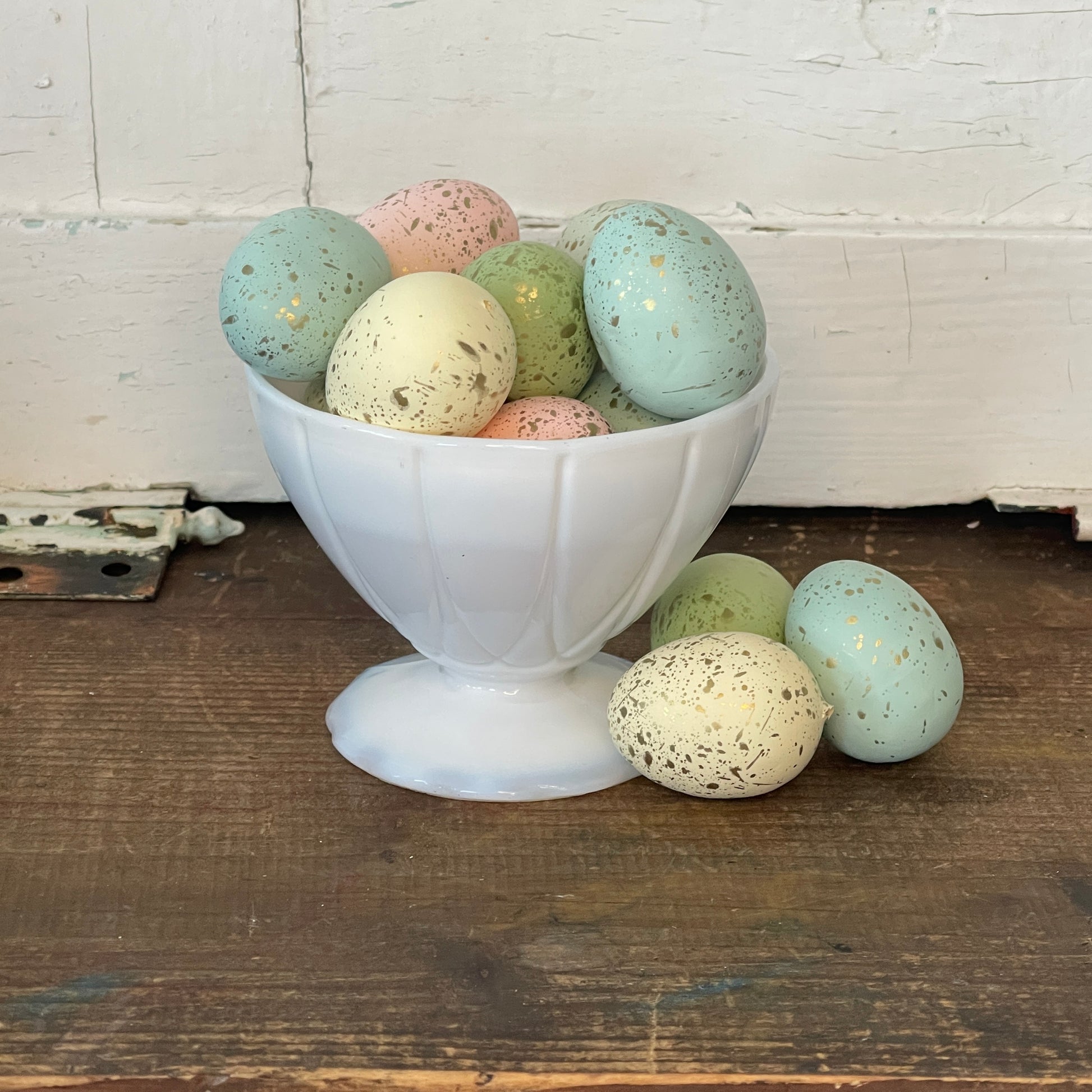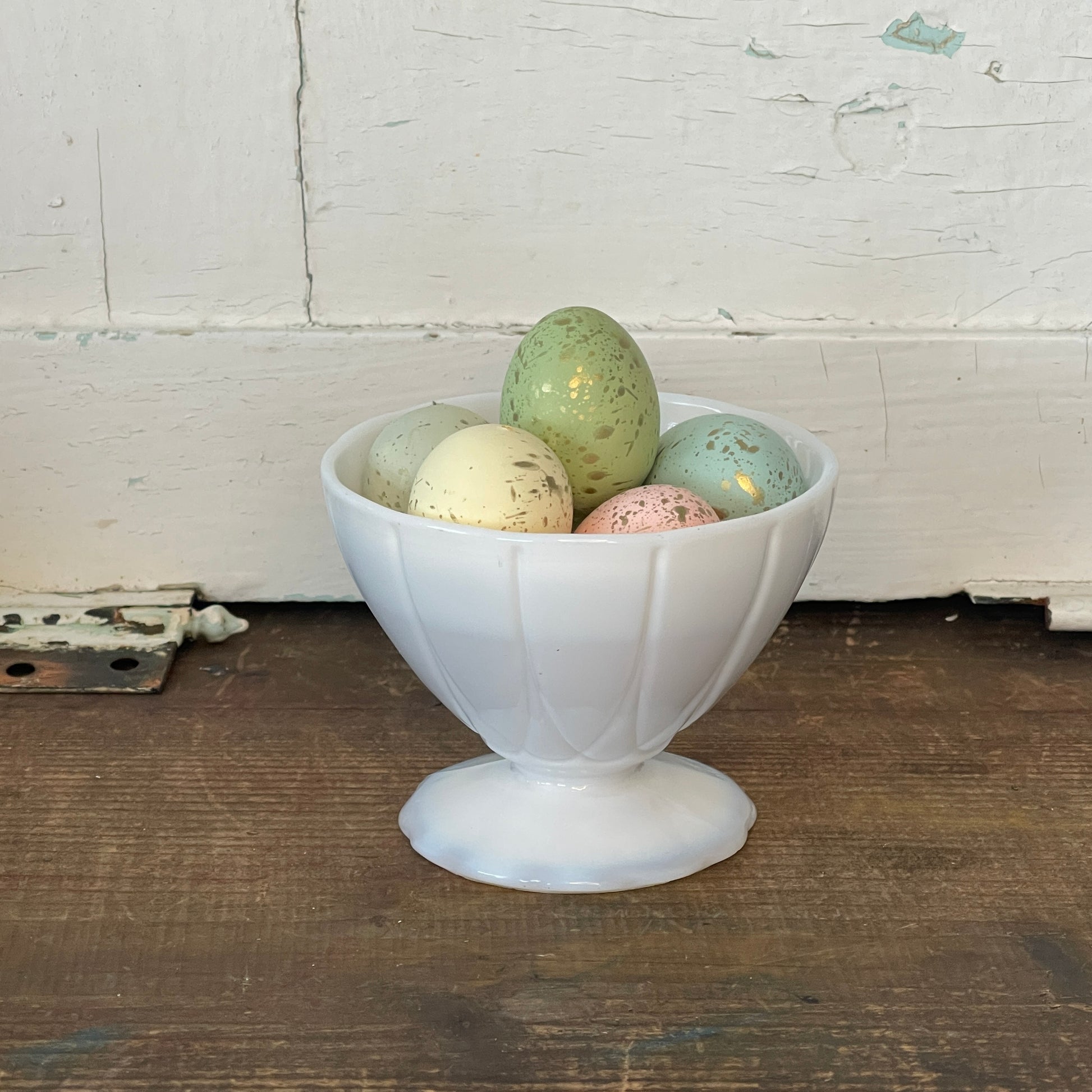 Vintage footed ice cream dish in white milk glass. Has a nice geometric pattern. Tapers down to scalloped base. There is a nice translucent quality along the scalloped edge of the base. It would look great filled with eggs for Spring or stacked in a cabinet with your collectibles.