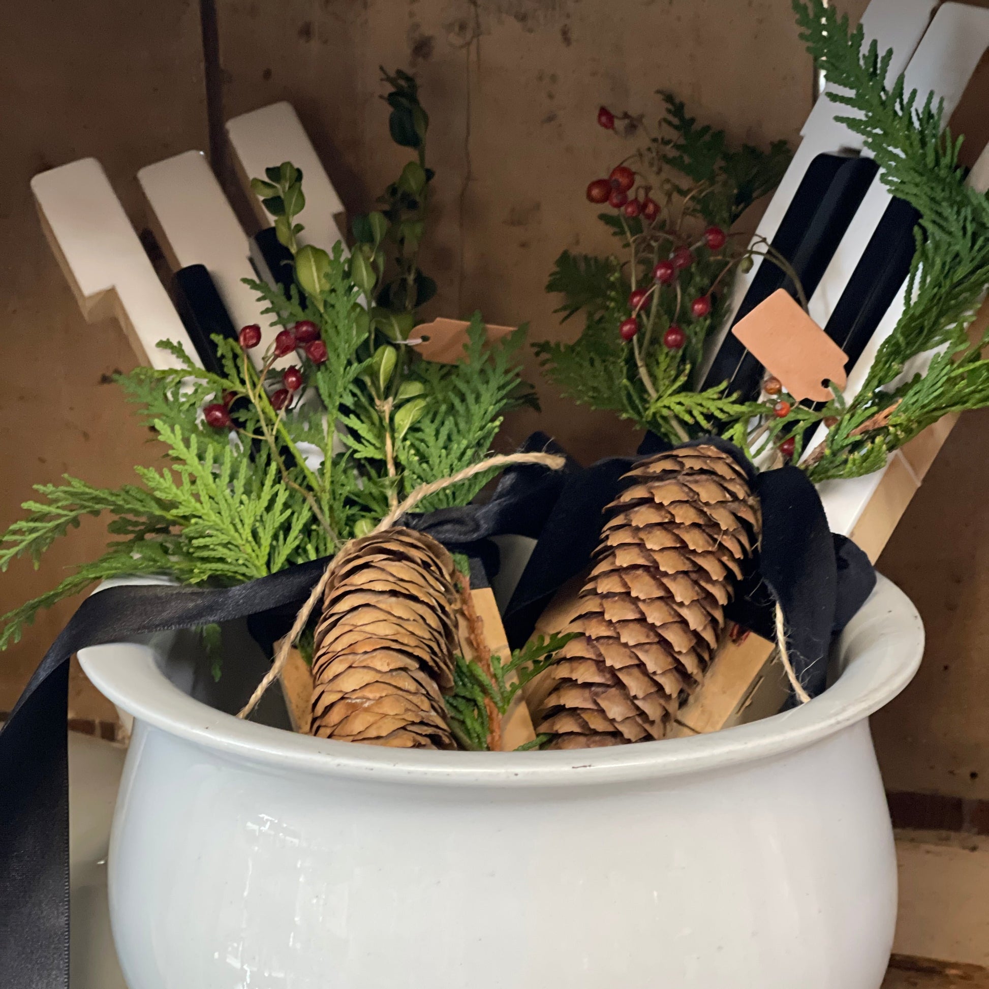 Transform any music space with a bundle of 5 vintage piano keys - 2 black keys and 3 white keys. These keys, made of wood with plastic coverings were salvaged from a vintage piano. Sold in sets of 5 and tied with ribbon, real cedar greenery, rose hips and a pine cone. The key numbers are mismatched and randomized.