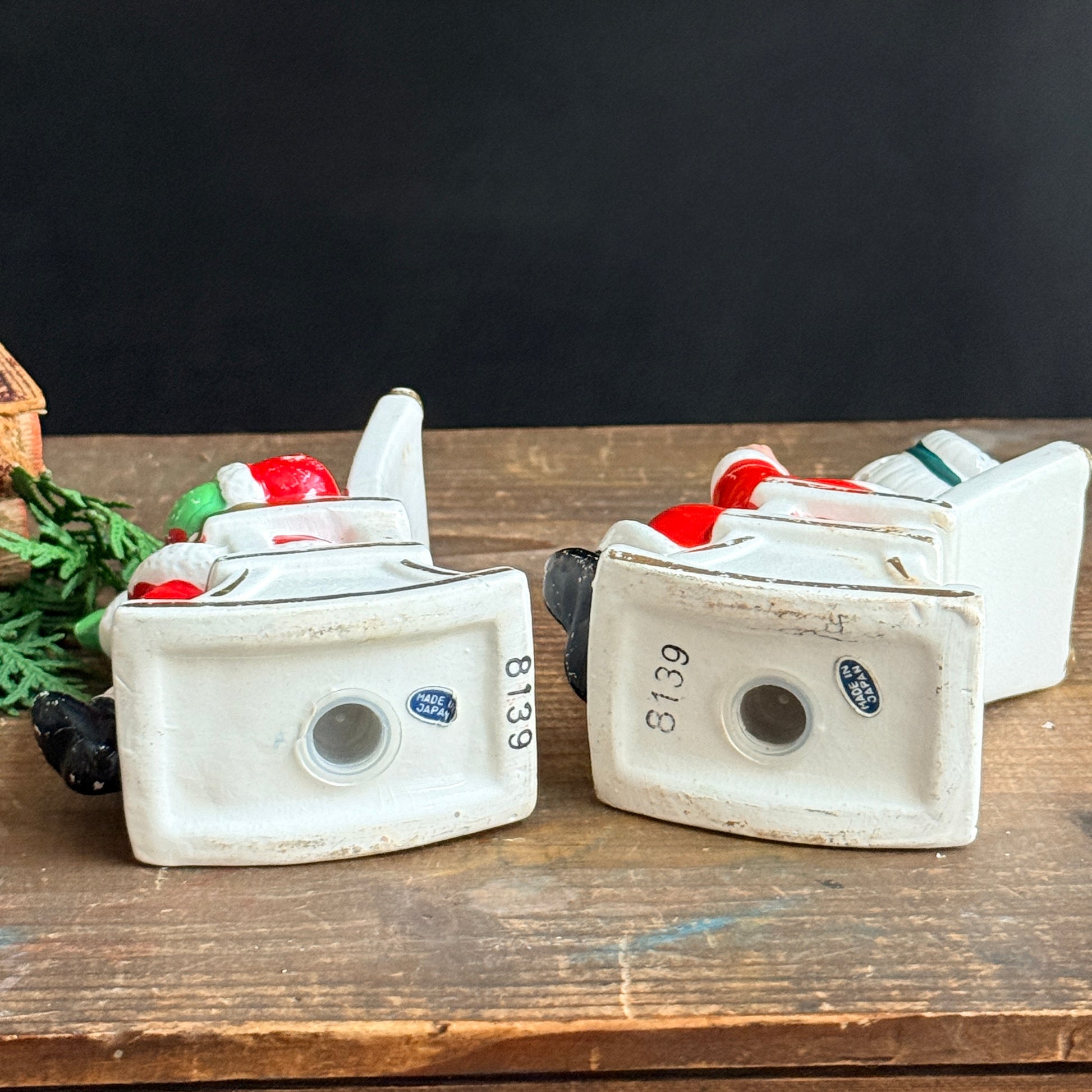 A darling set of vintage Mr. and Mrs. Claus rocking chair salt and pepper shakers. Made in Japan and marked 8139, with original plastic stoppers in place.
