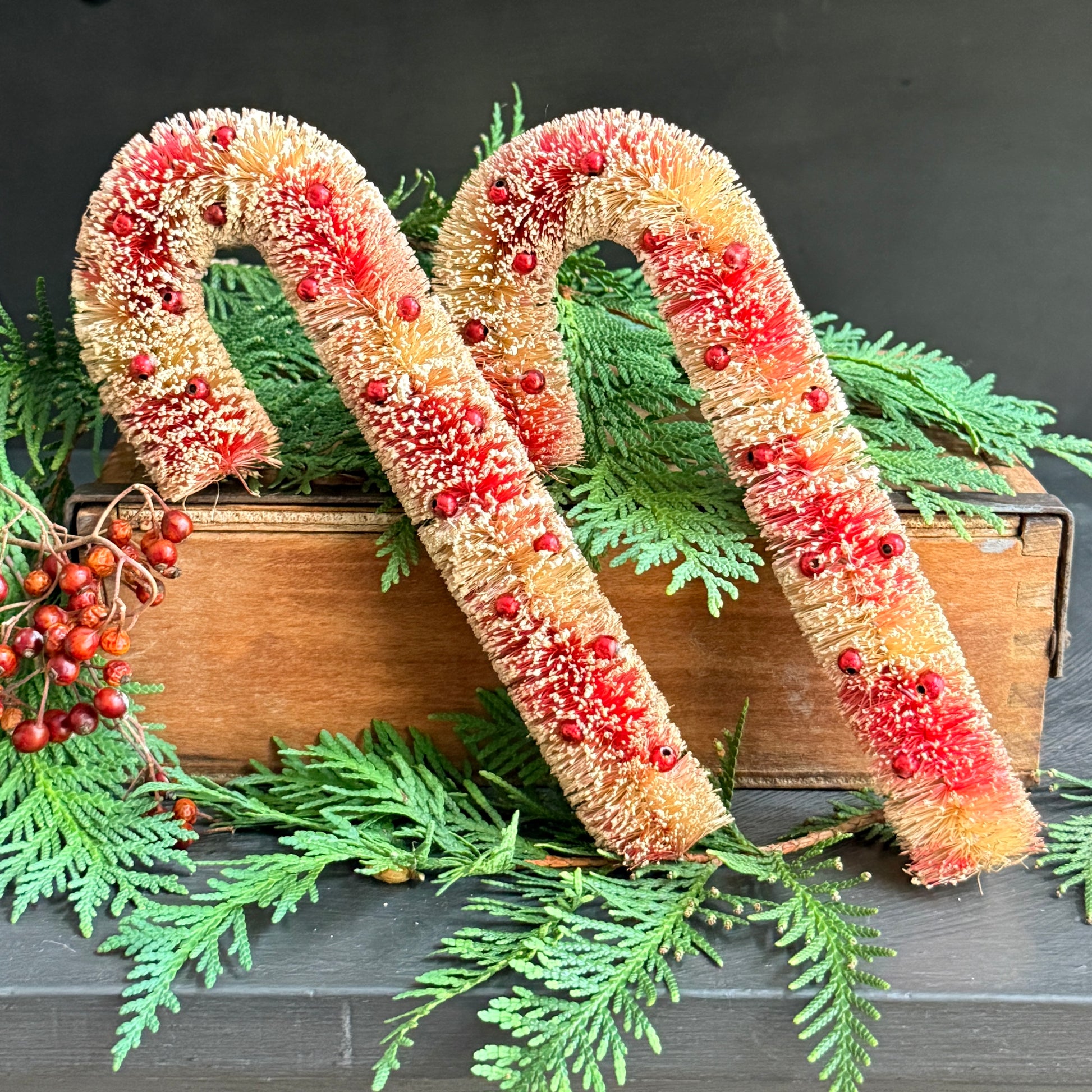 A festive bristle candy cane with classic red and off-white stripes, adorned with small red ball ornaments and a snowy white coating for extra holiday charm. Hang from a tree, stocking or tie on a gift for that extra special touch! New decor item.