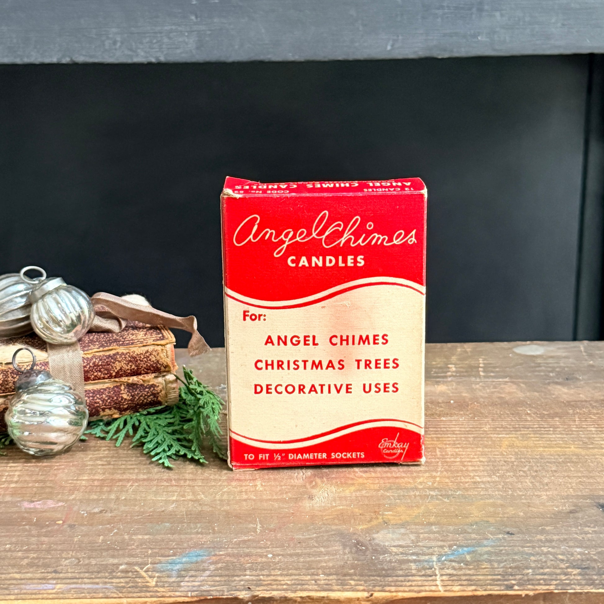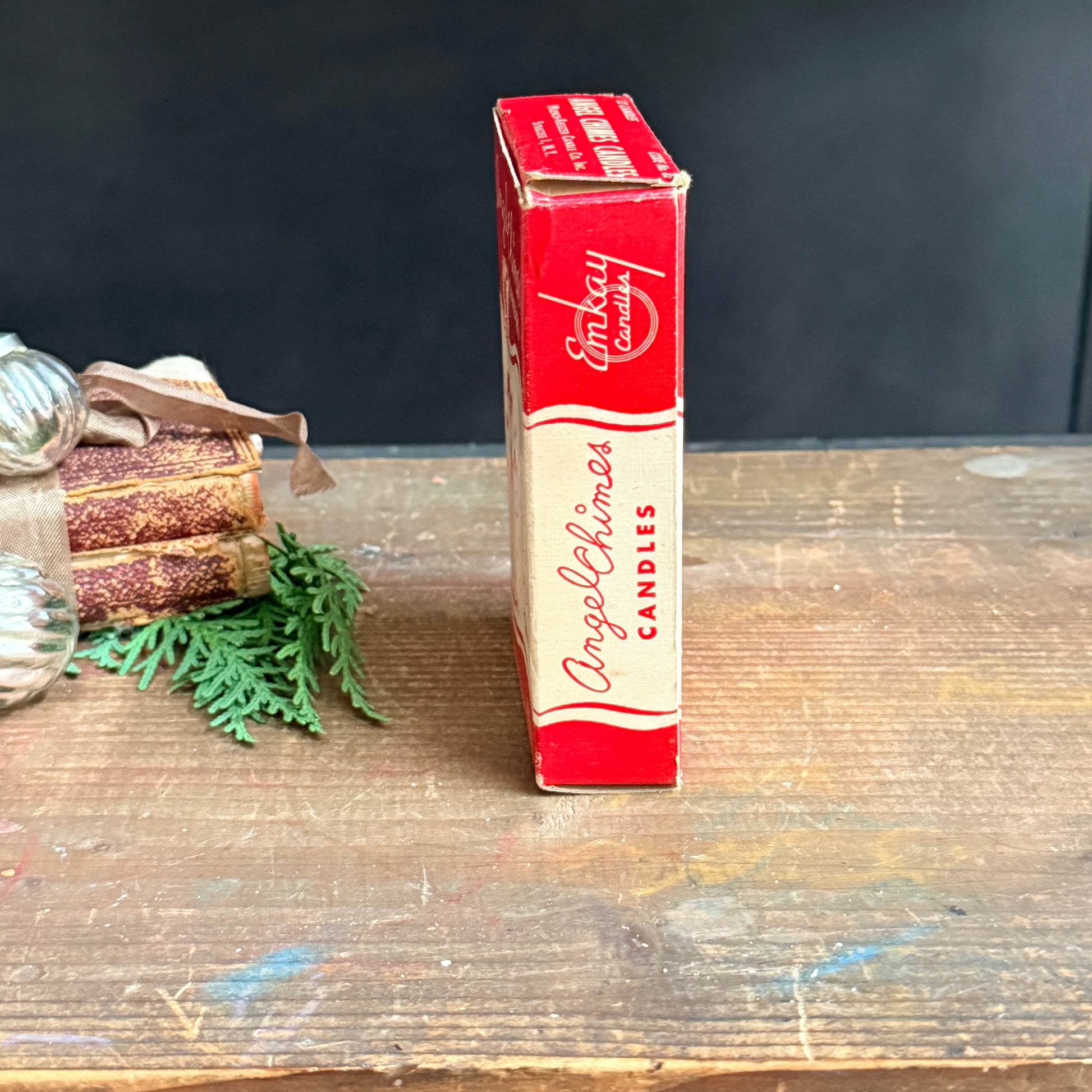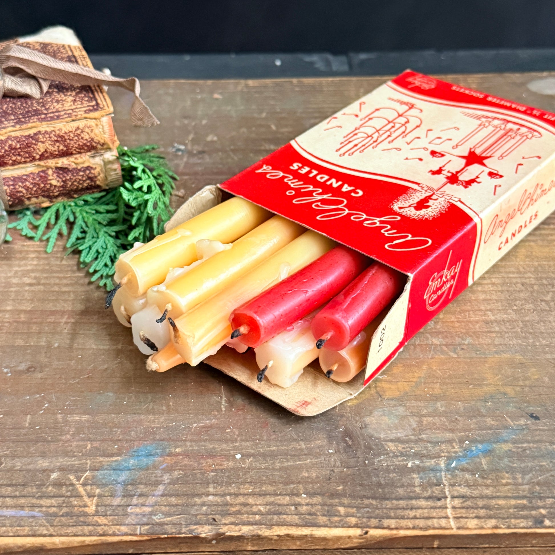 Charming vintage candle box filled with burned wax candles in assorted colors. Red and off-white cardboard box with classic graphics. Perfect for adding retro holiday spirit.