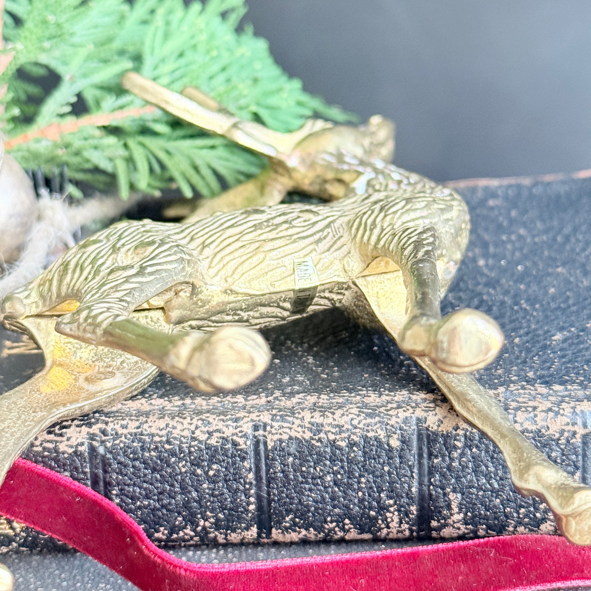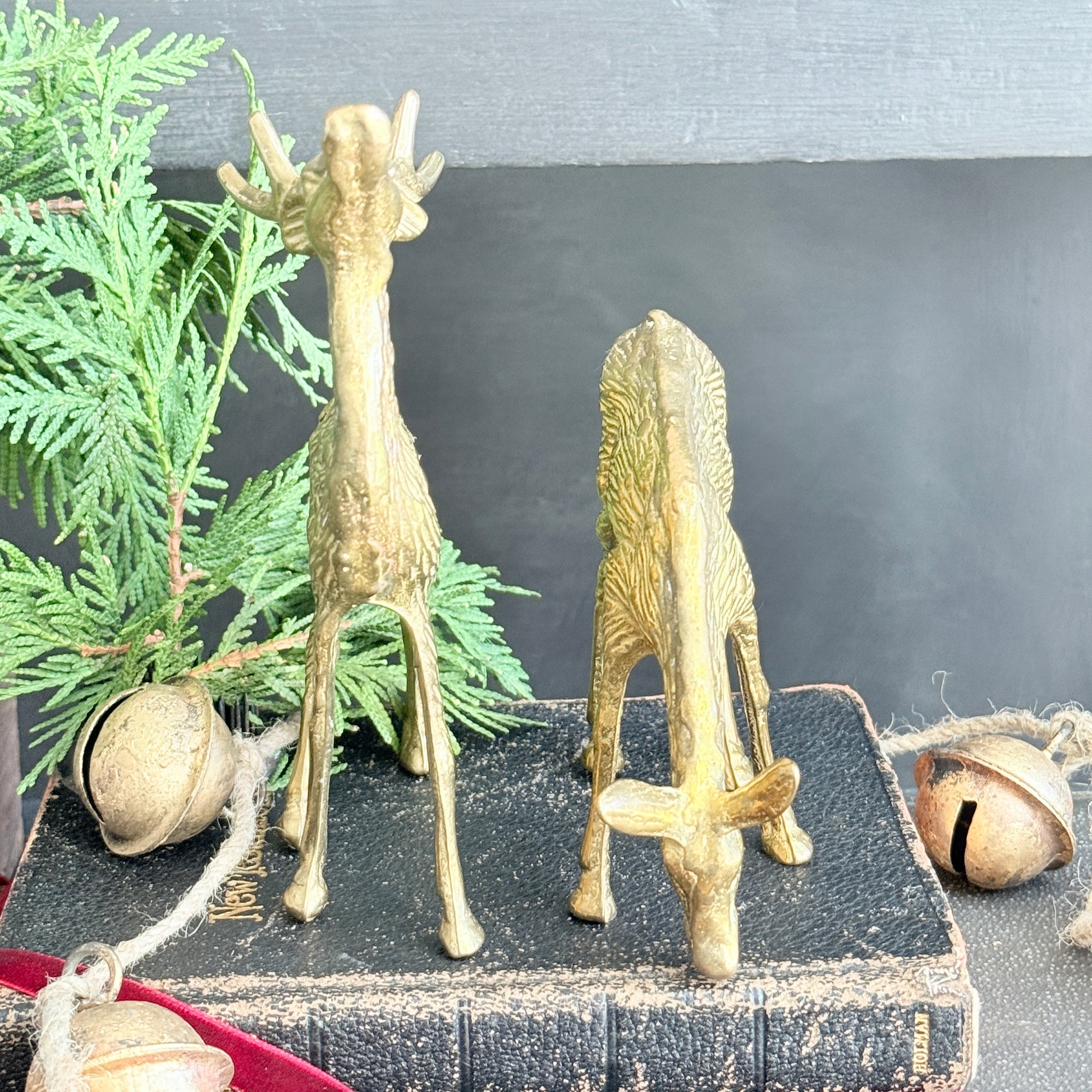 A charming pair of midcentury brass deer figurines featuring a doe and buck with detailed and spotted texturing. Natural oxidation patina adds vintage character to these decorative pieces.