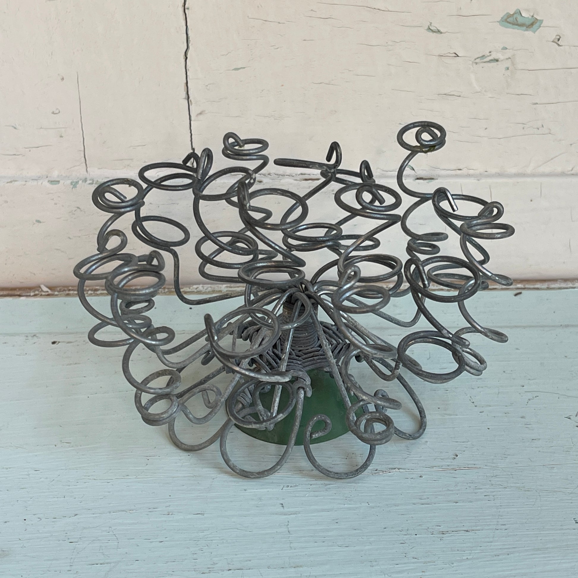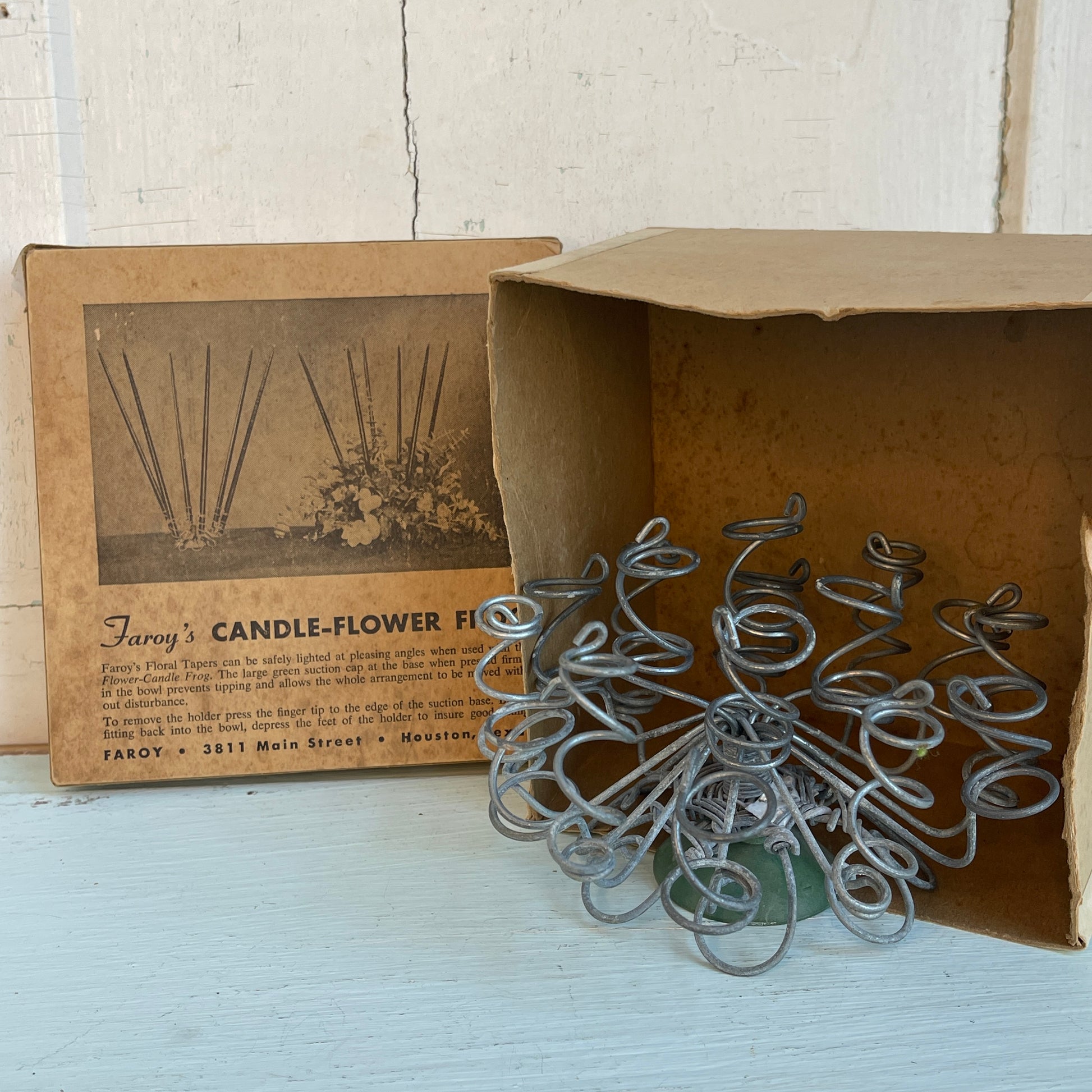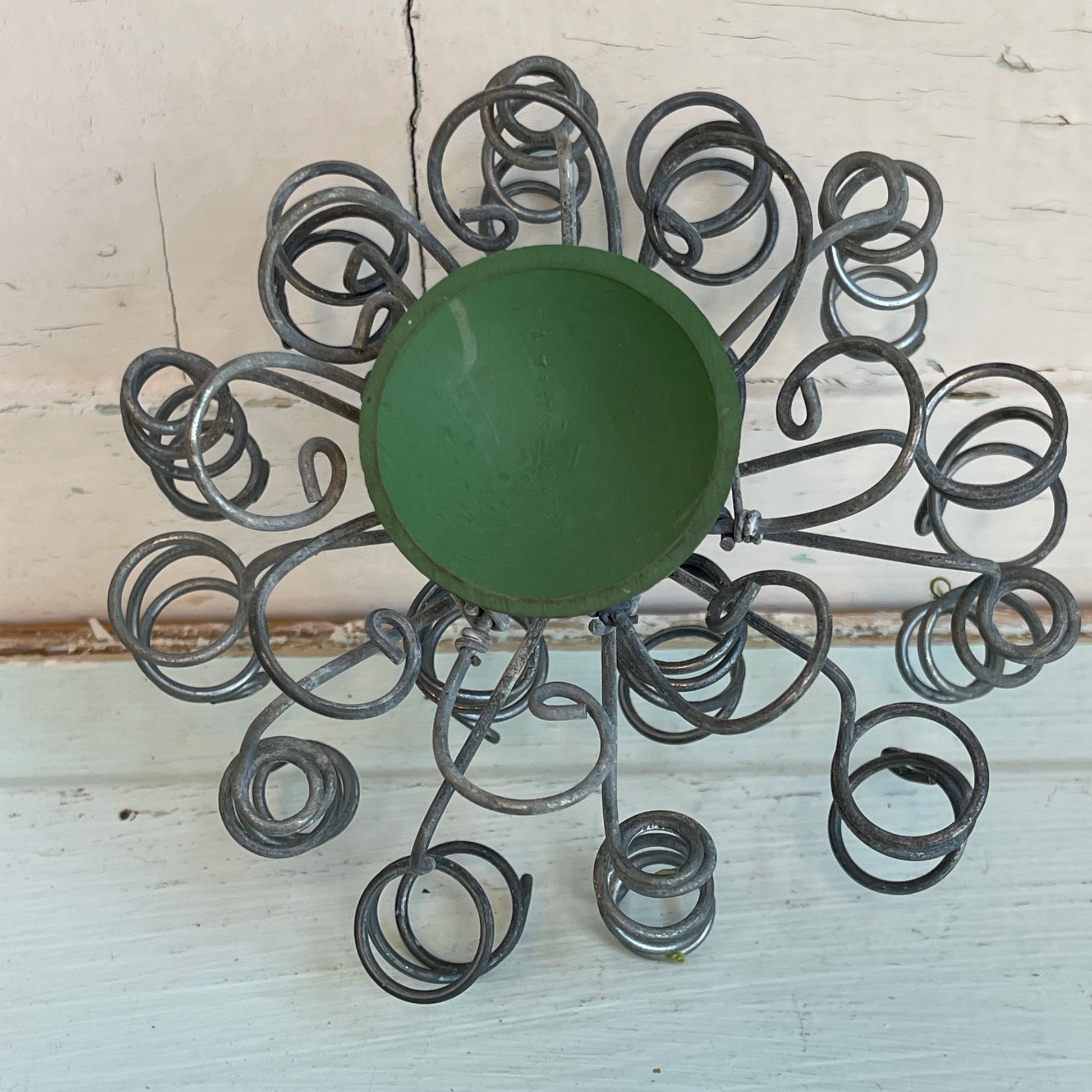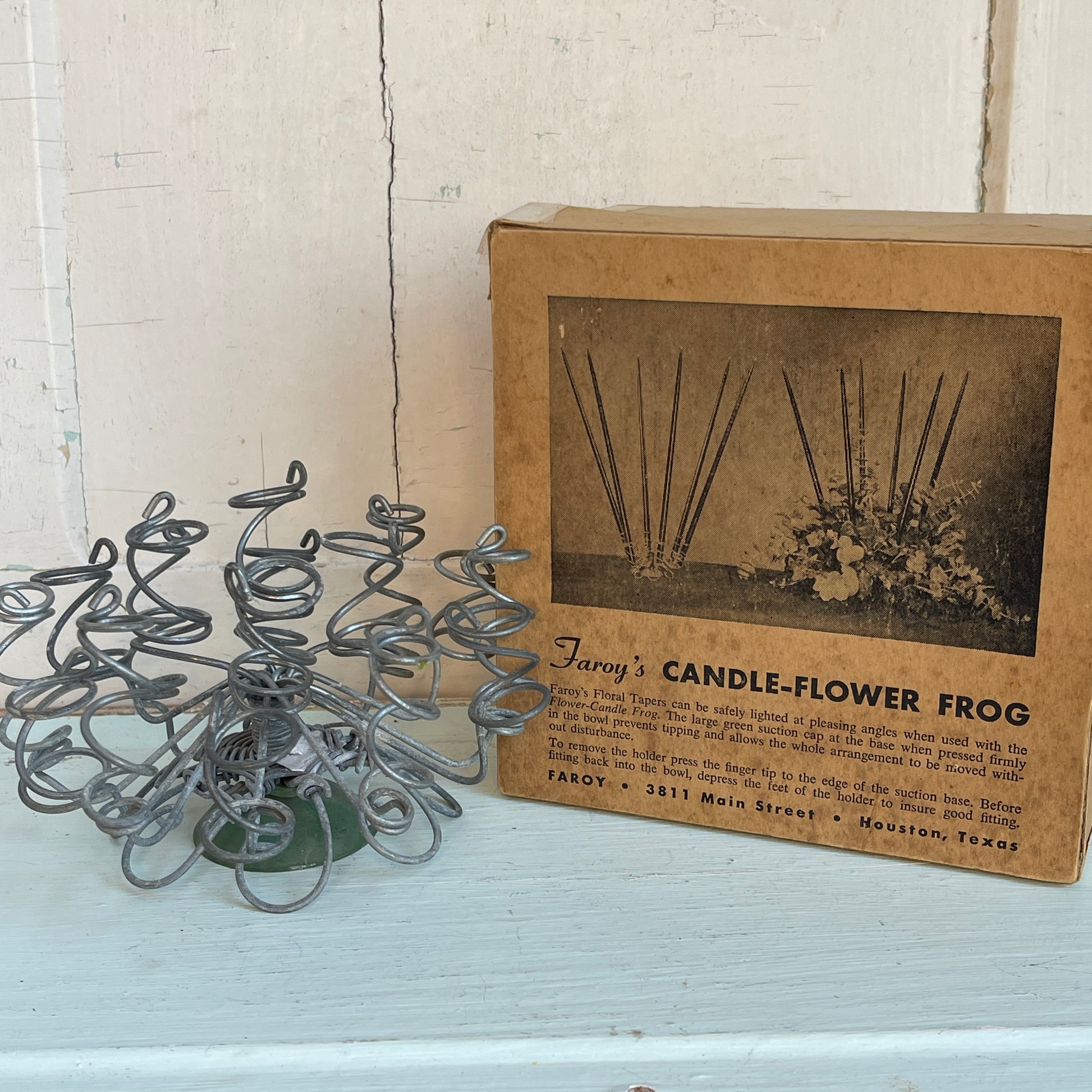 This rare and unique metal coil flower frog by Faroy’s is a true gem for floral enthusiasts and vintage collectors alike. Designed with a suction cup base for stability, its wire coils securely hold flowers—and even candles—allowing for creative and elegant arrangements.
