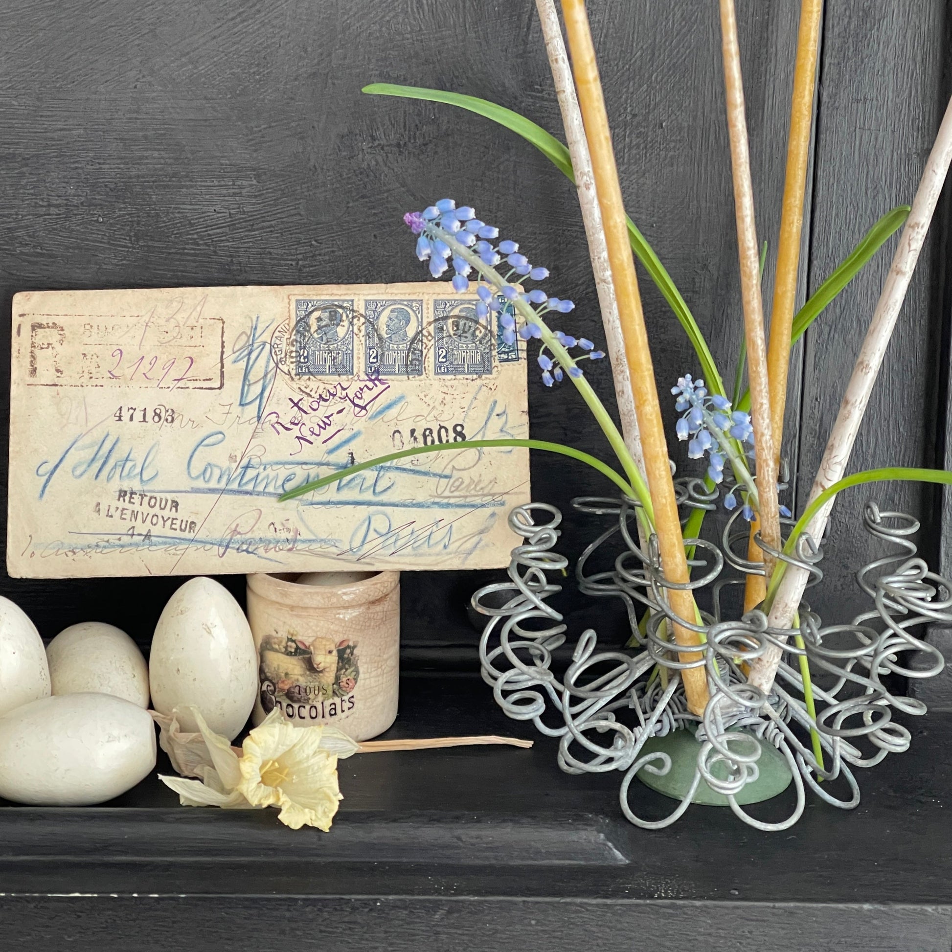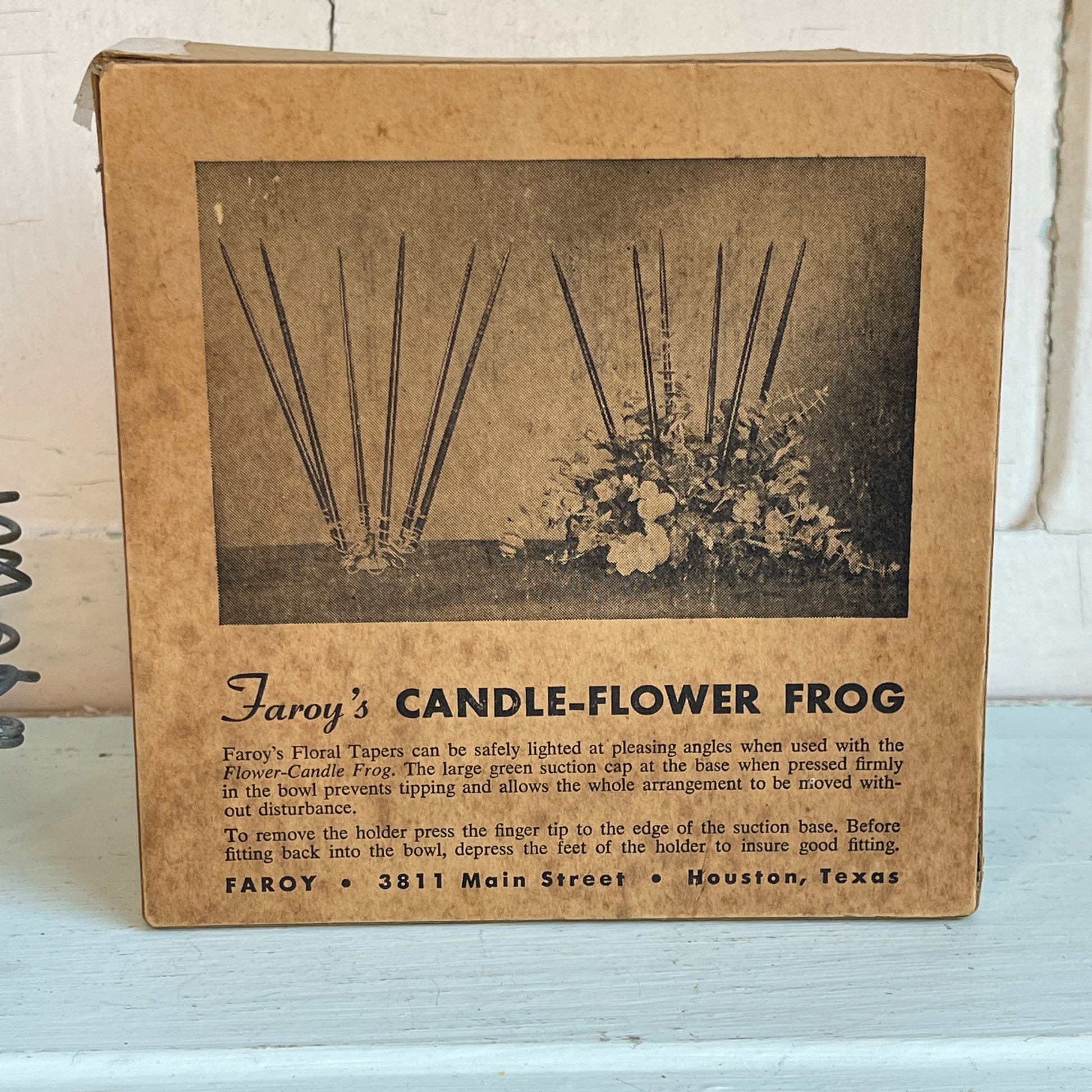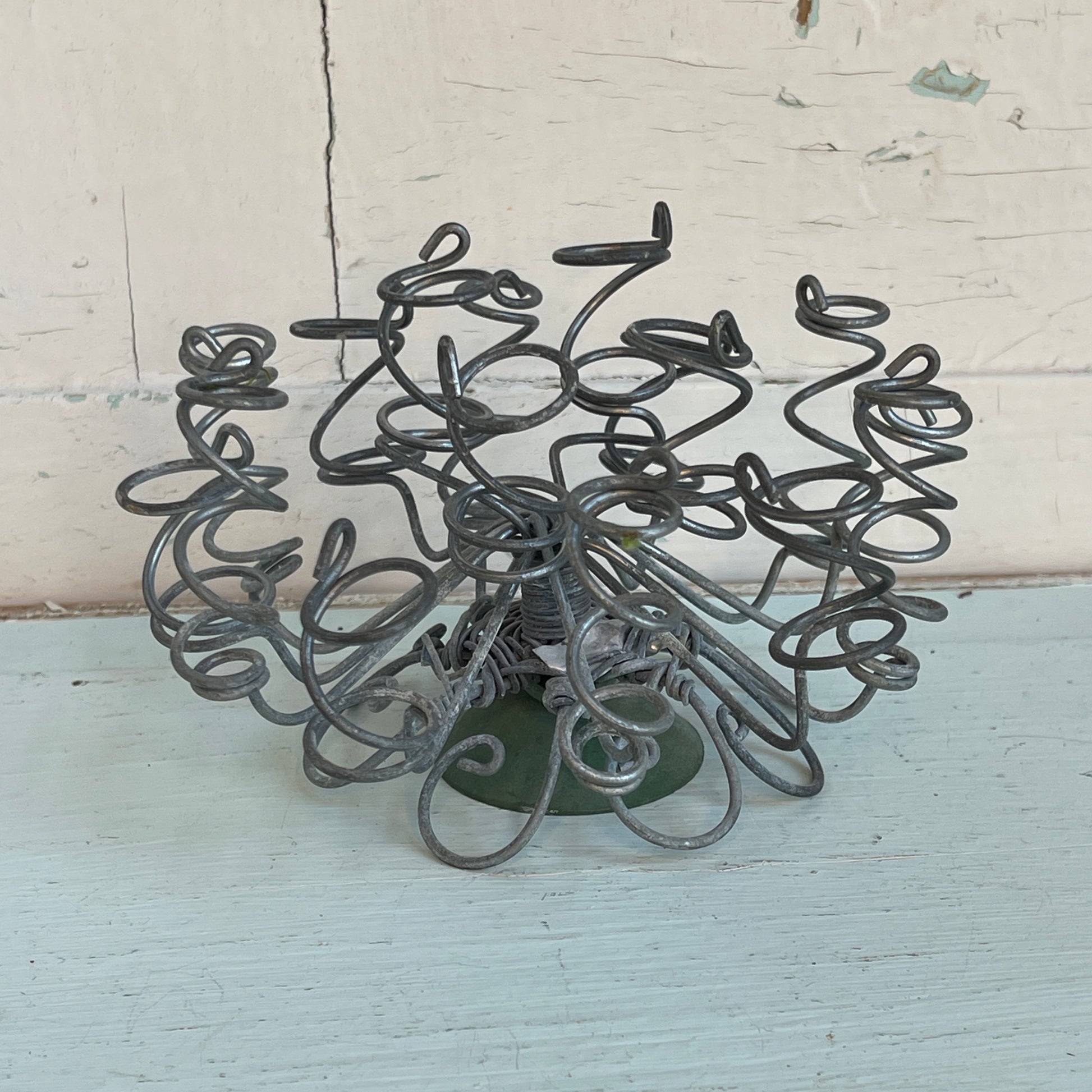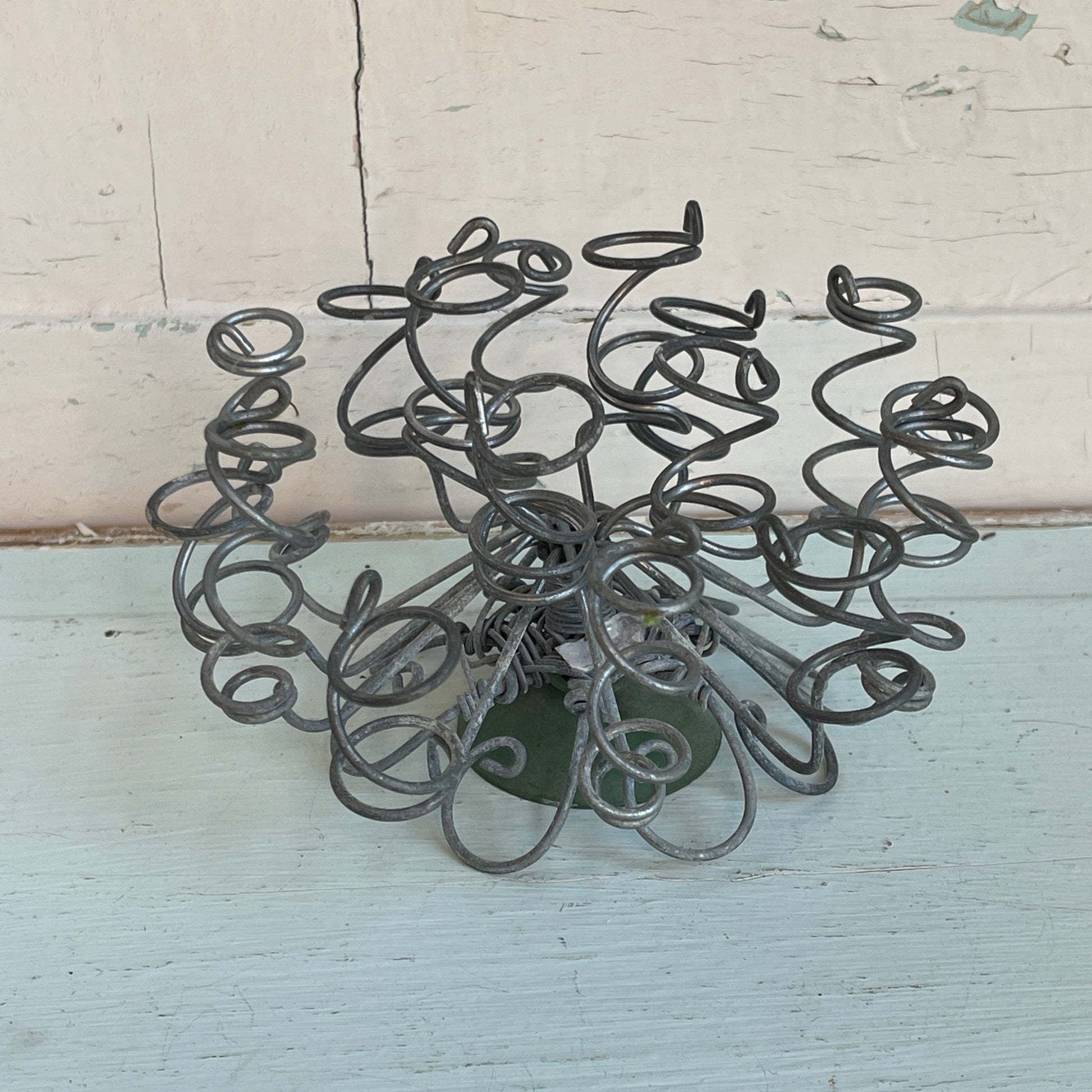 This rare and unique metal coil flower frog by Faroy’s is a true gem for floral enthusiasts and vintage collectors alike. Designed with a suction cup base for stability, its wire coils securely hold flowers—and even candles—allowing for creative and elegant arrangements.
