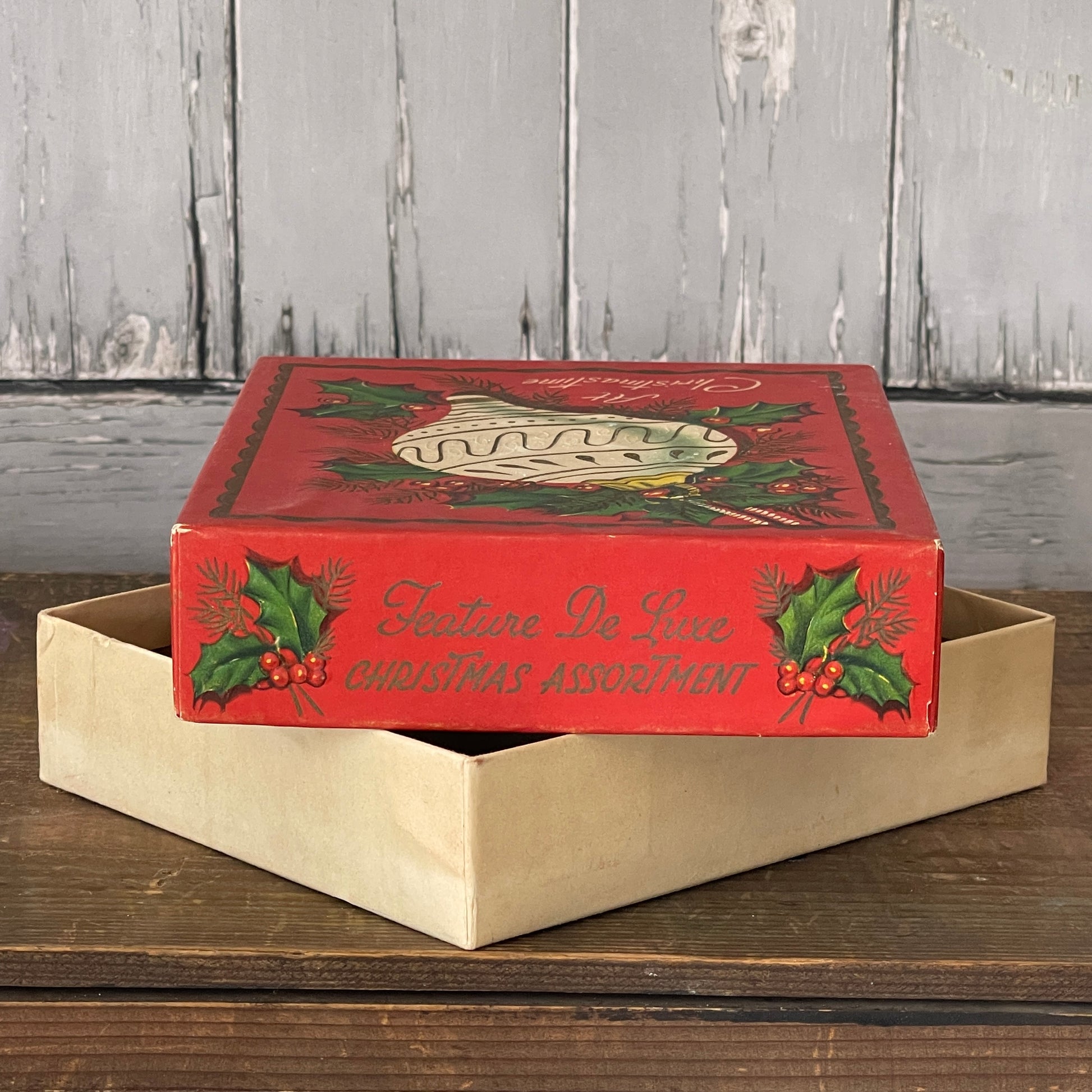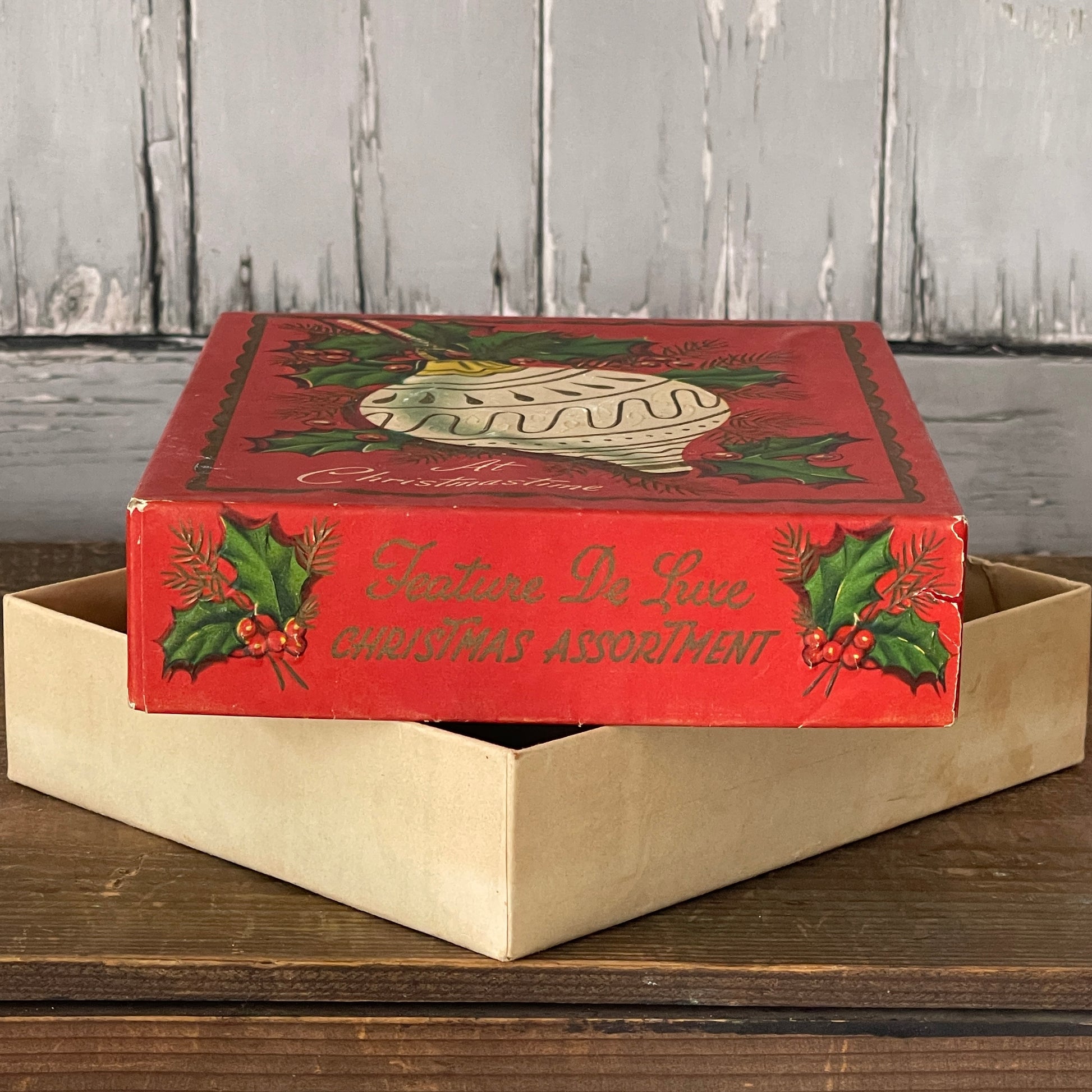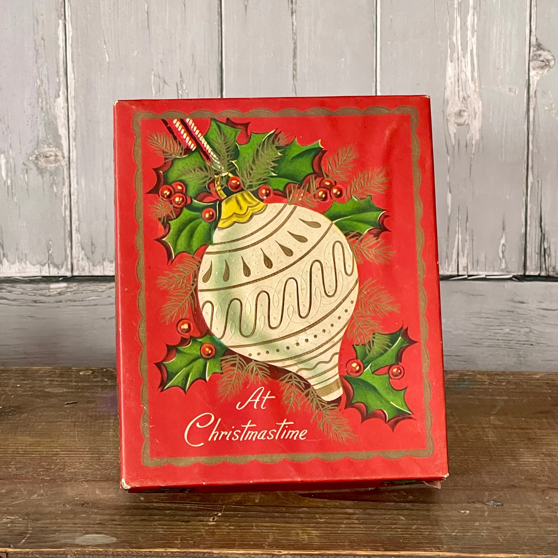 Empty Cardboard Box. Once held Christmas Greeting Cards. Box is red with holly berries, greenery and a lovely ivory and gold ornament. Reads “At Christmastime”, on cover. “Feature De Luxe Christmas Assortment” along both sides.