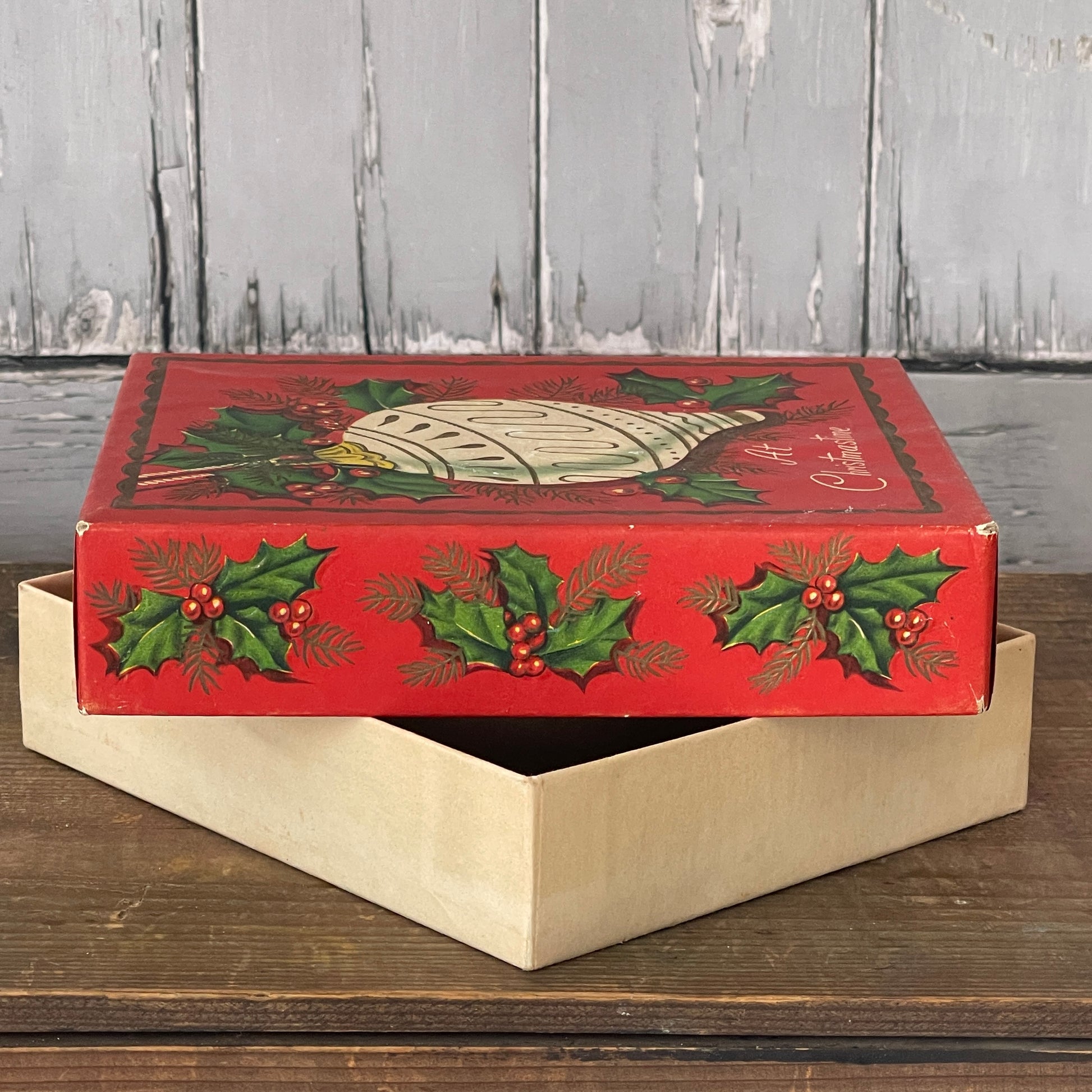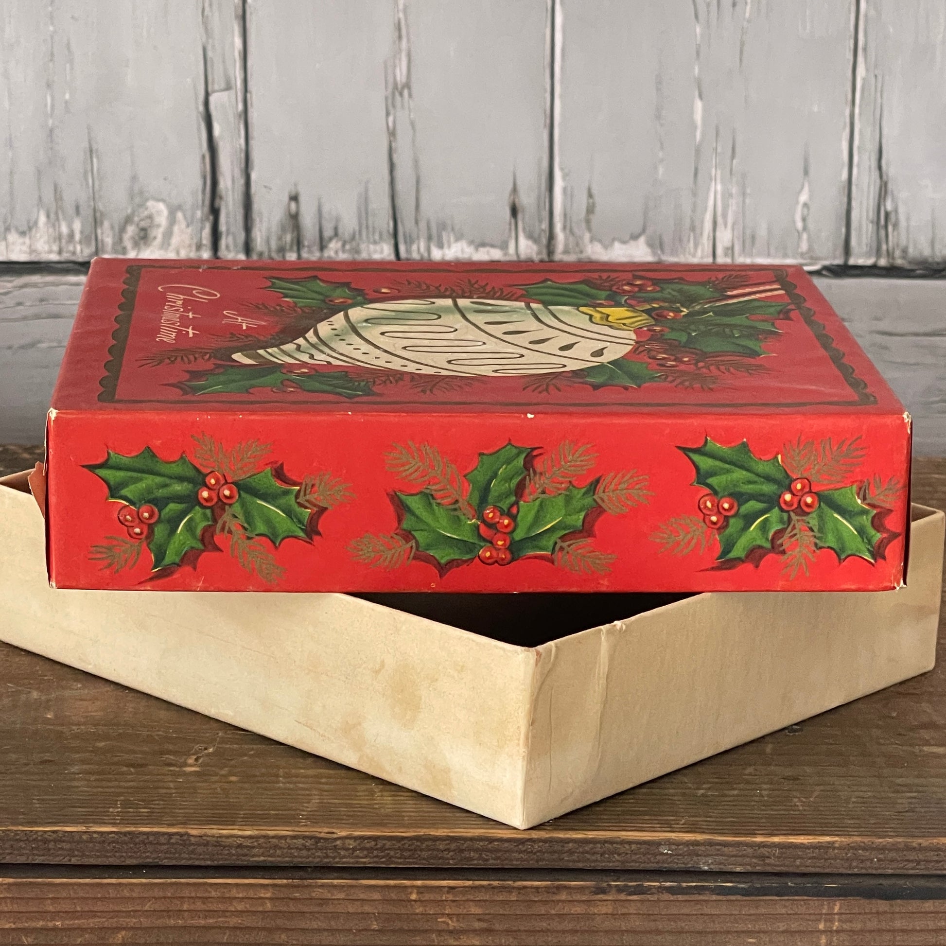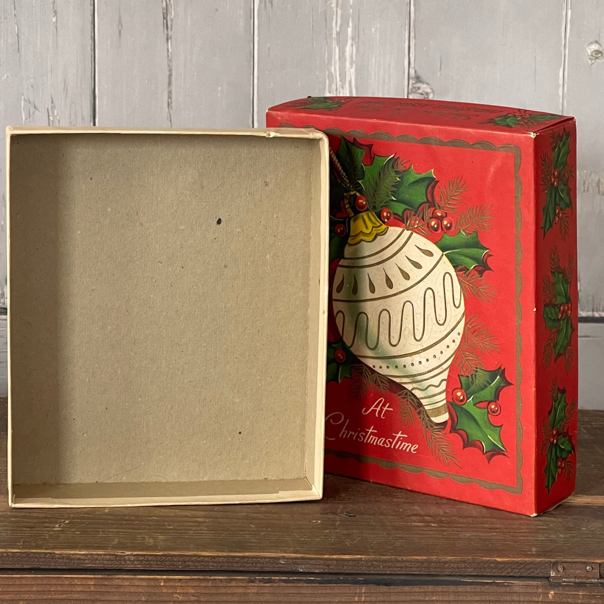 Empty Cardboard Box. Once held Christmas Greeting Cards. Box is red with holly berries, greenery and a lovely ivory and gold ornament. Reads “At Christmastime”, on cover. “Feature De Luxe Christmas Assortment” along both sides.