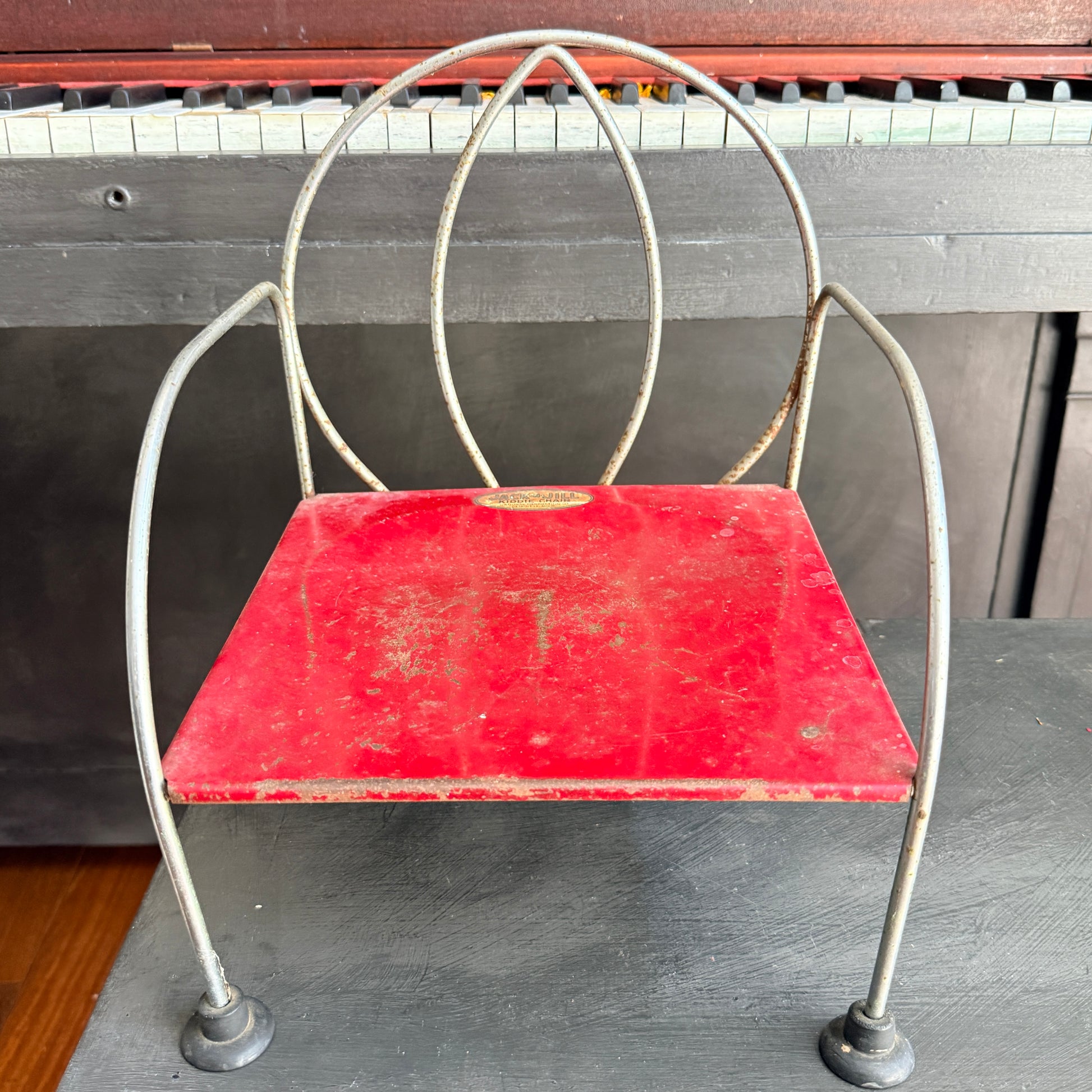 Jack-N-Jill Kiddie Chair-Detroit, MI. Metal construction, painted red seat with silver metal backing, arms and legs. Original rubber stoppers on feet. Sturdy piece, yet spotted with rust.