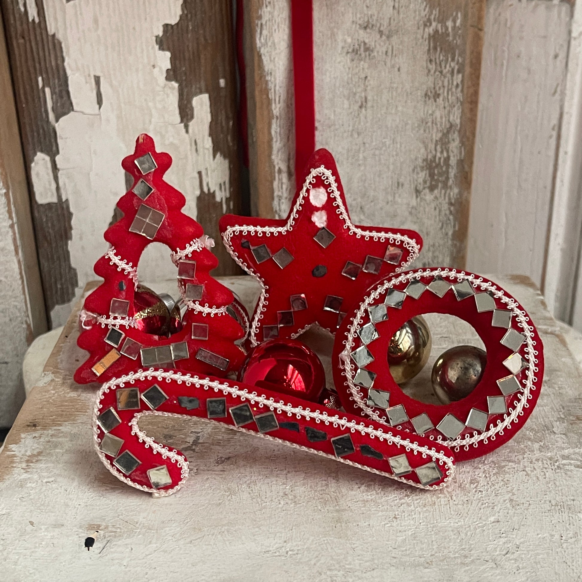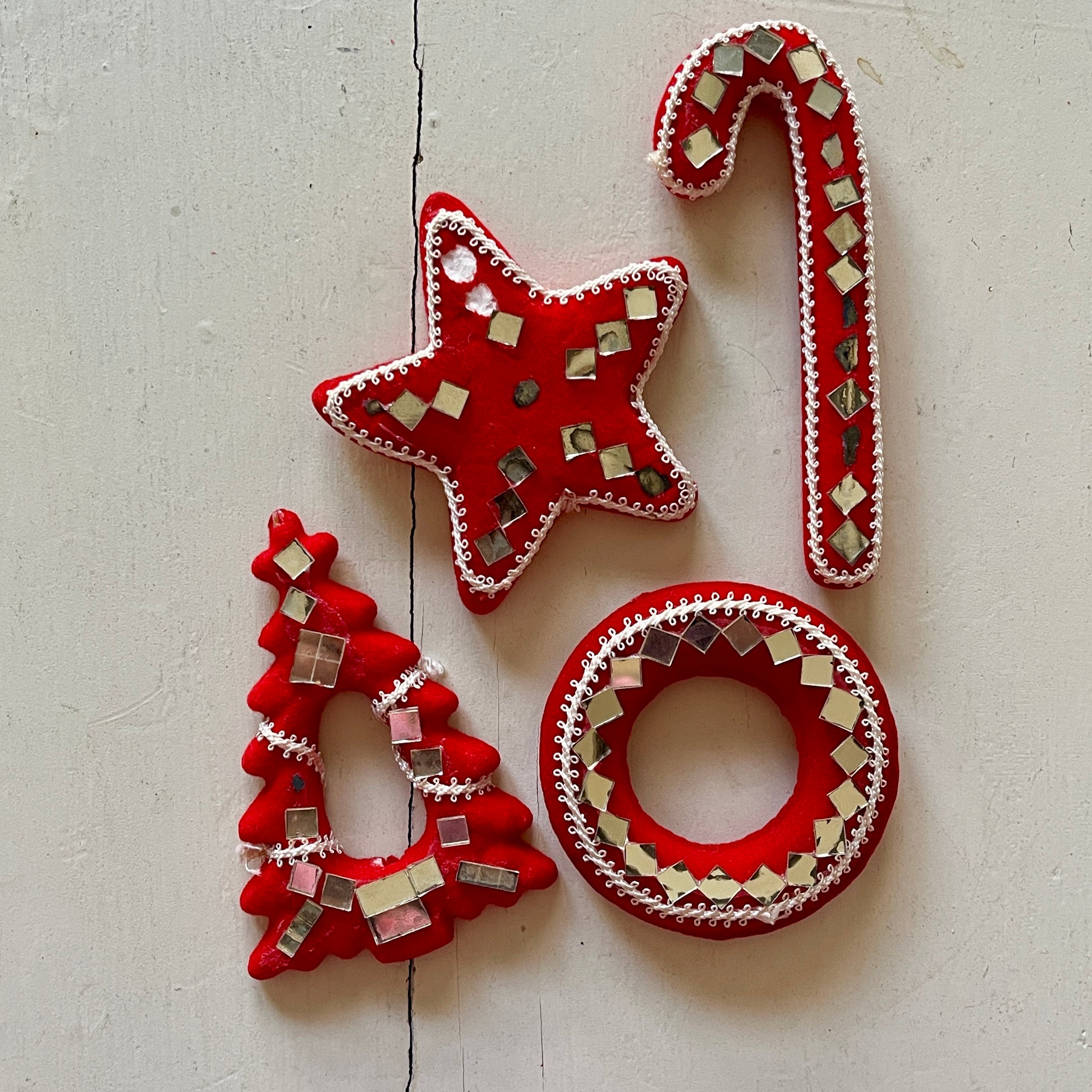 Set of Four Red Felt Ornaments with mirror details. Star and cane have missing areas. 4.5”-3”