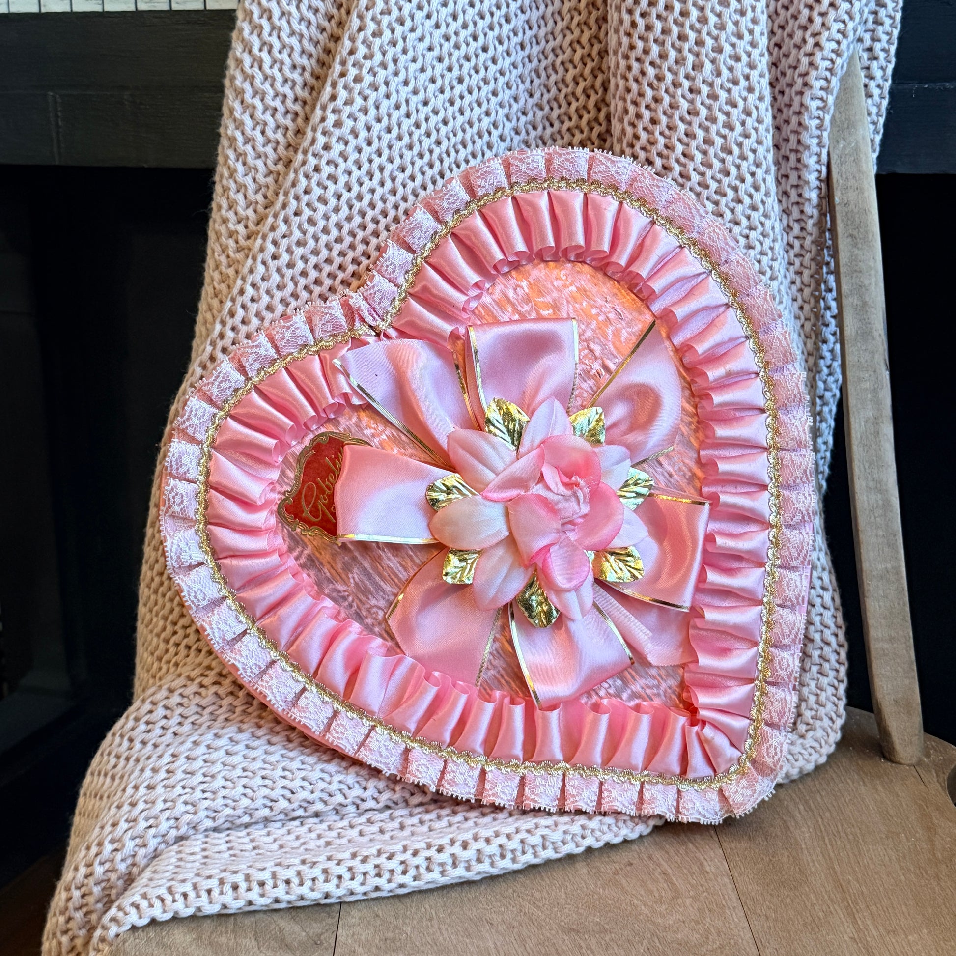 A charming 1966 Gobelin's Chocolate box in soft pink with gathered ribbon, lace and gold trim. Decorated with a faux flower, pink ribbon bow with gold edges. This vintage piece retains its original interior liner and dividers, both with chocolate staining. Perfect for collectors of nostalgic Valentine's memorabilia or vintage packaging. Sold as found.