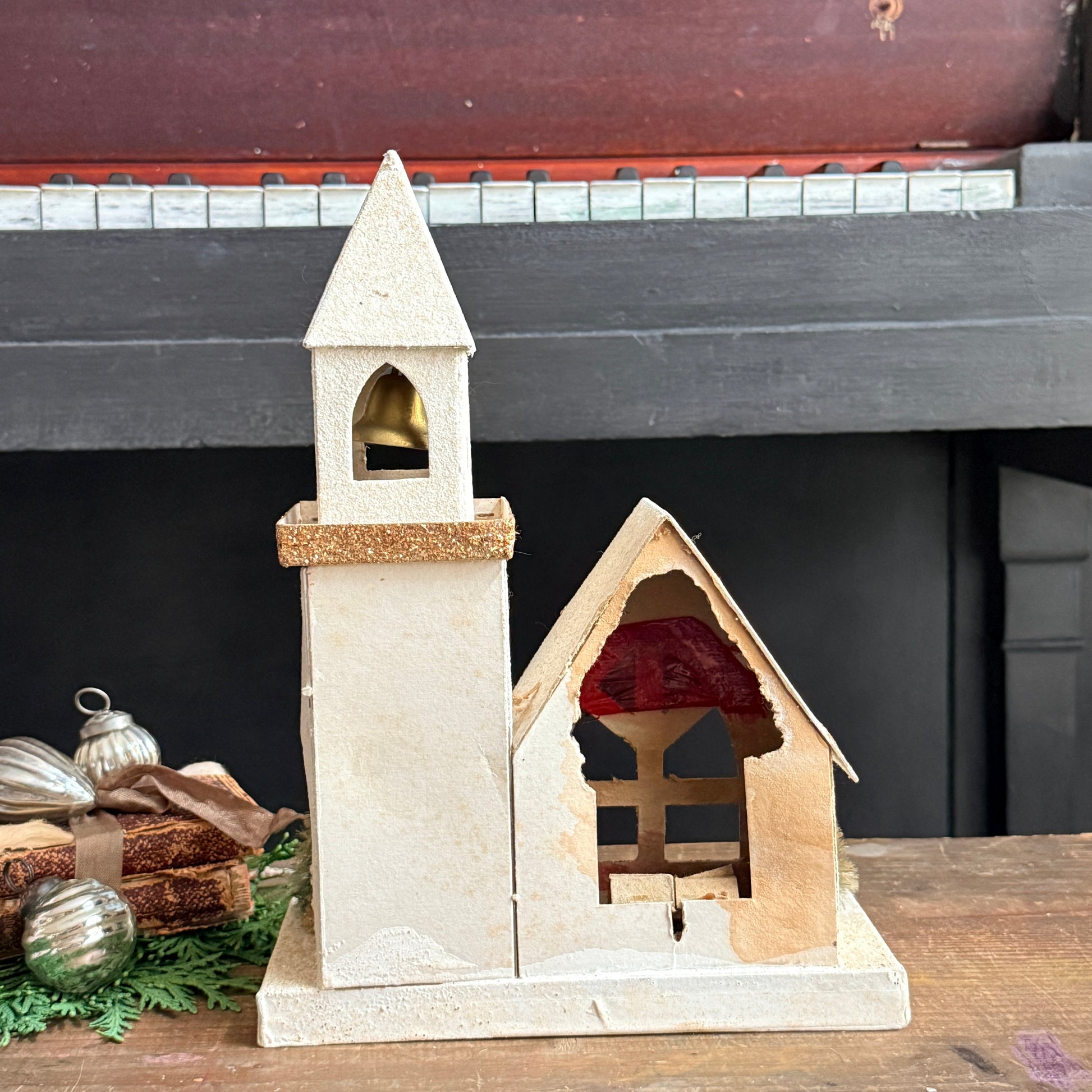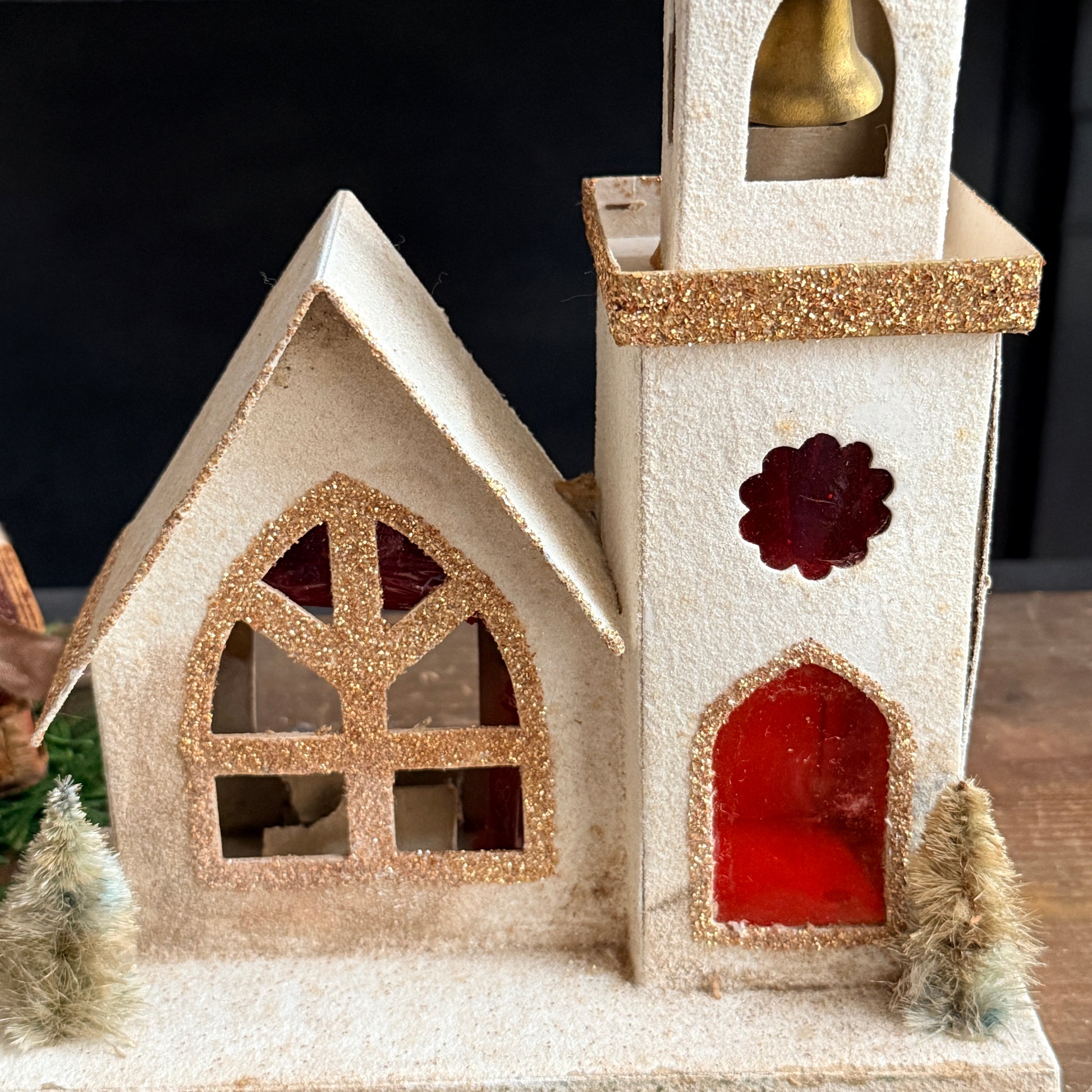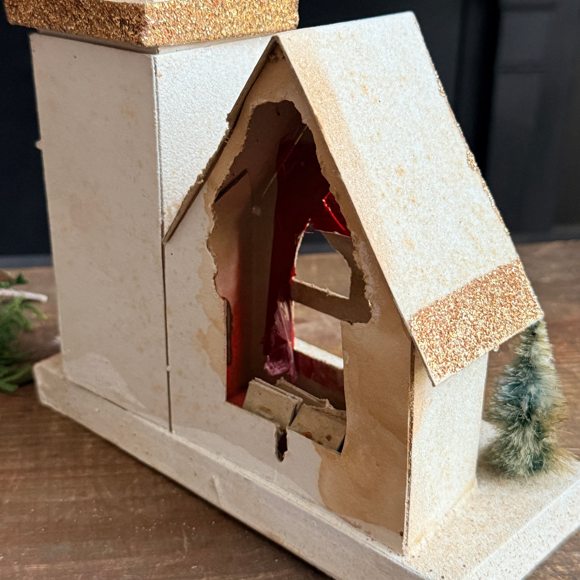 Large vintage cardboard Putz church. White cardboard glitter house, with gold glitter trim and bell. Red cellophane is broken and missing. Aged and well worn condition with staining, spotting, tears and missing cellophane. Trees are brittle, one has been repaired. Please see pictures.