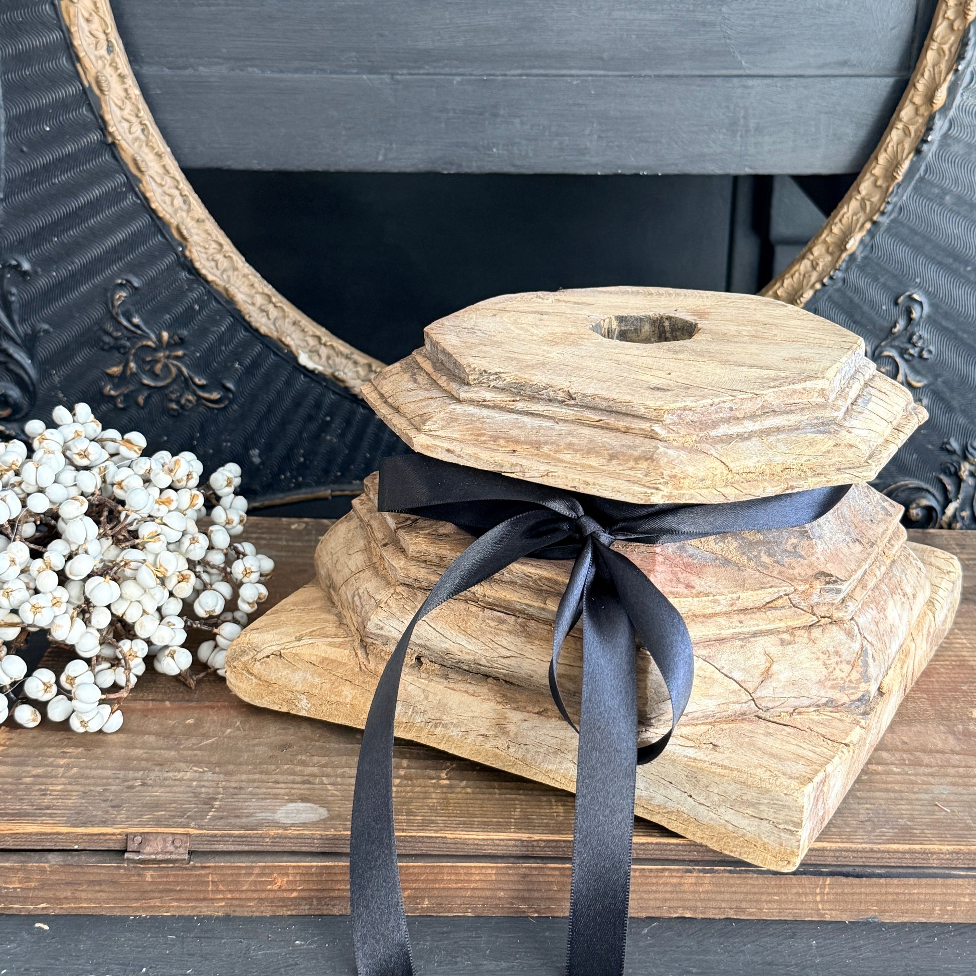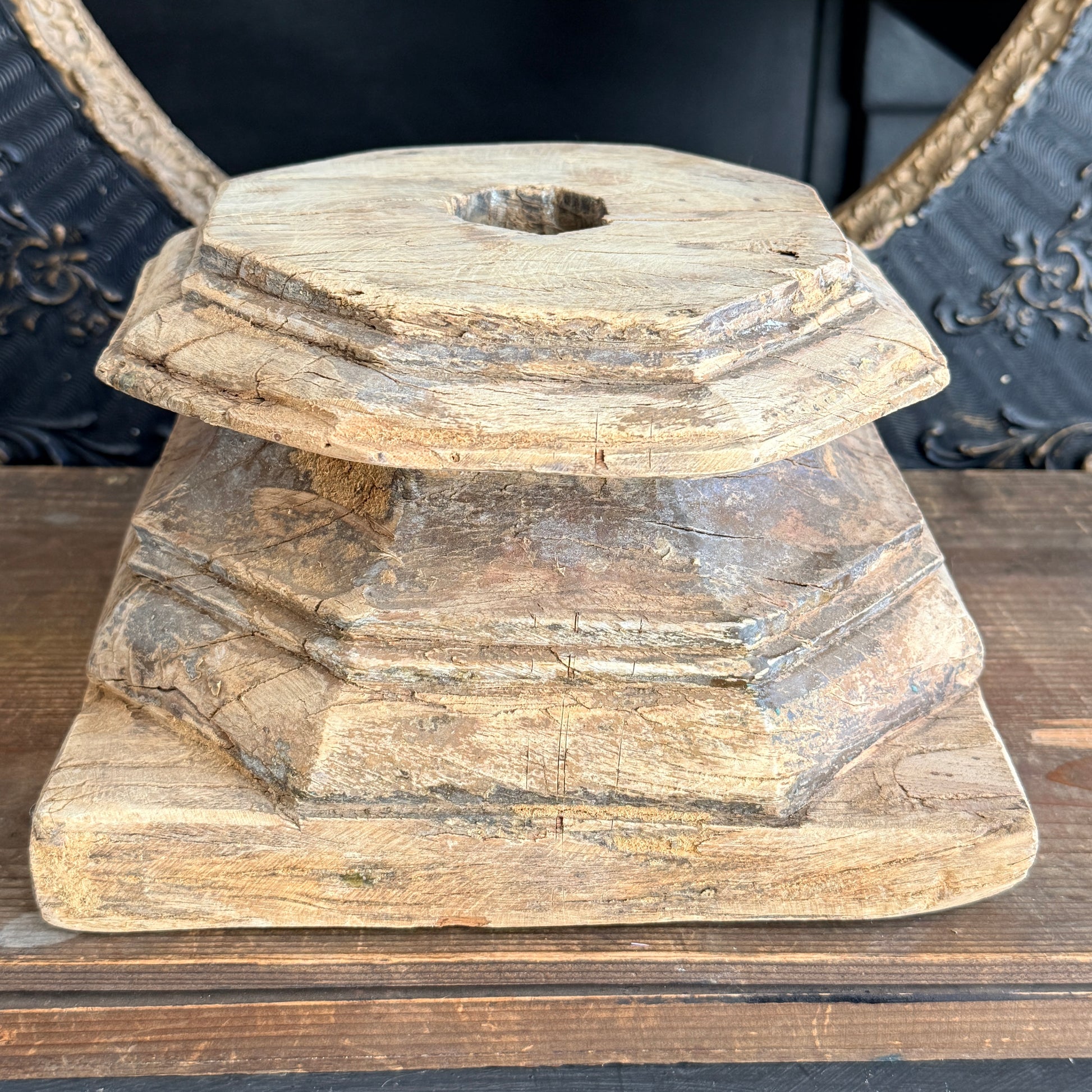 Hand-carved wooden architectural element salvaged from vintage Indian structures. These solid-wood capitals feature natural bleaching and varied designs, each approximately 8" square and 6" tall. Use as a riser for decorative accents, candle holders, or display pieces. One-of-a-kind character in every piece.